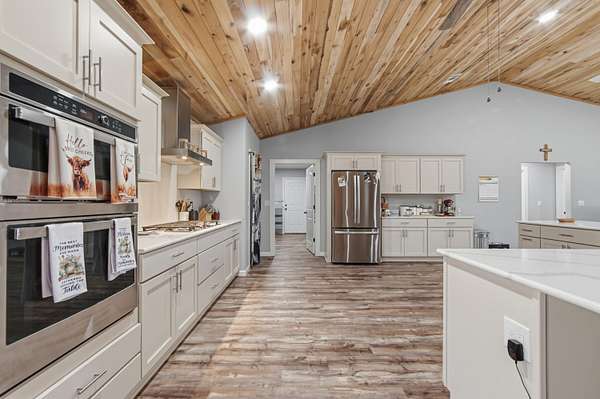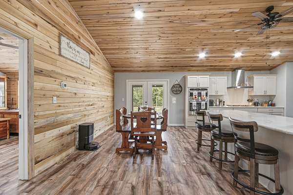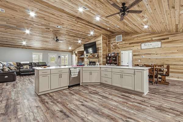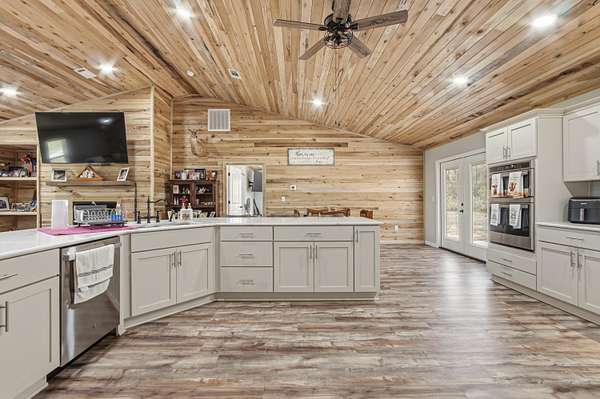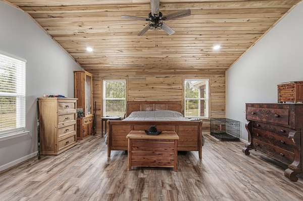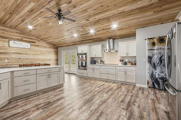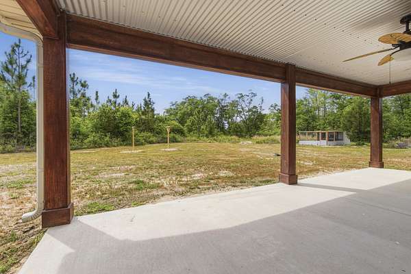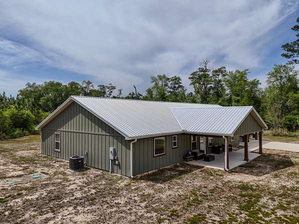 Custom-built Country home on 11.3 acres. 3/3 beauty offers 2400 sqft of heated and cooled living space and 4032 sqft under roof perfect for family gatherings. Home welcomes you with a large covered front porch and enters into a grand open living/kitchen combo with vaulted ceilings covered in poplar wood. Living room offers custom built ins centered around a fireplace, kitchen features a farmhouse sink, bar that sits up to 10 people, built-in oven and microwave combo, gas range, and custom cabinetry. MBR is covered with poplar wood as well, offers his and her closets, double vanities in BA, custom tile shower and large soaker tub. Spray-foamed ceilings and batten insulation keep energy cost low. Outside a 50-amp RV hookup, carport, and large covered back porch,
