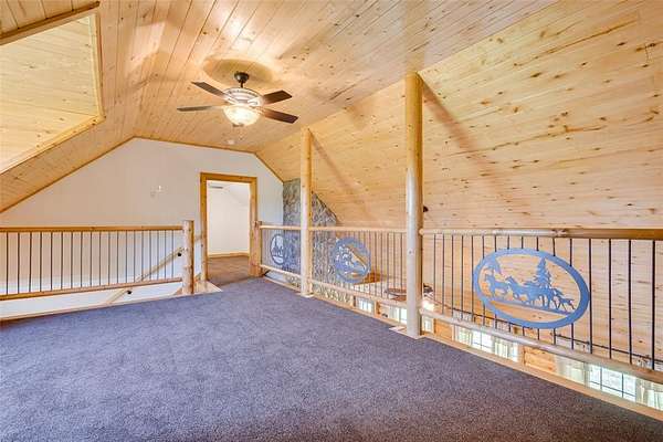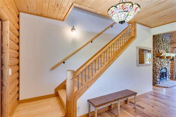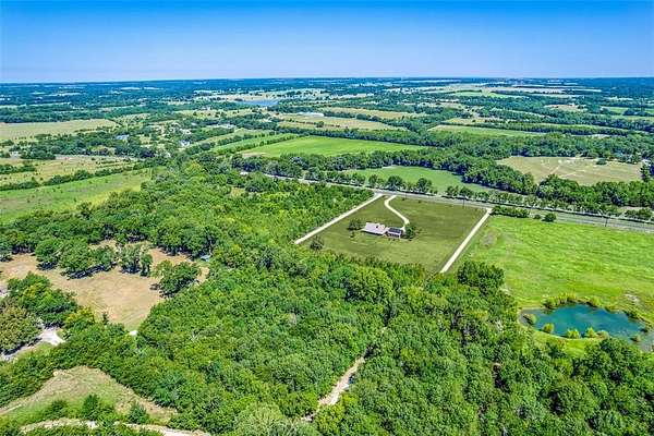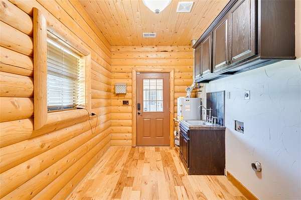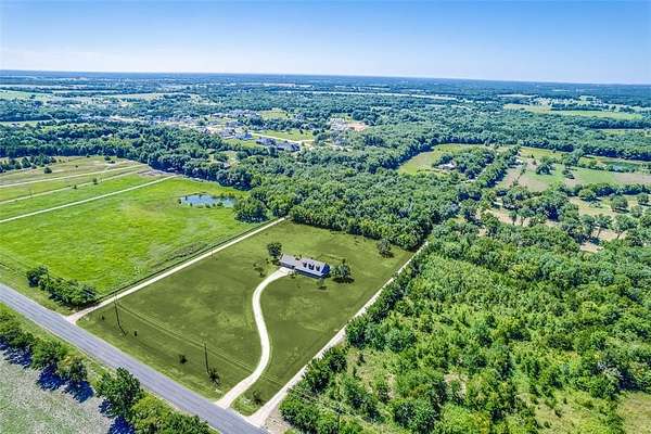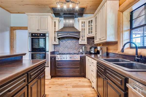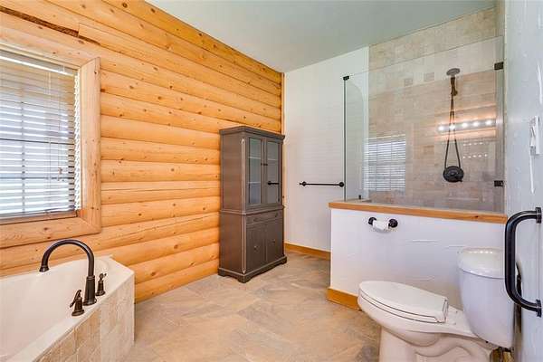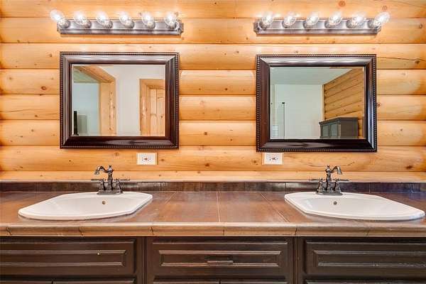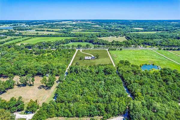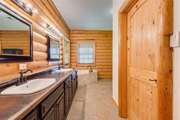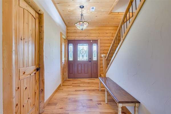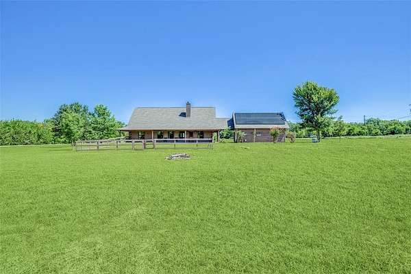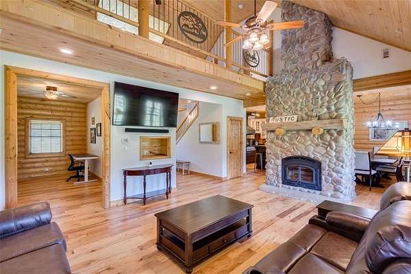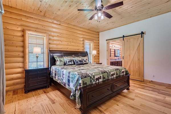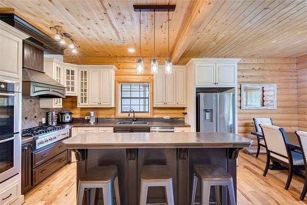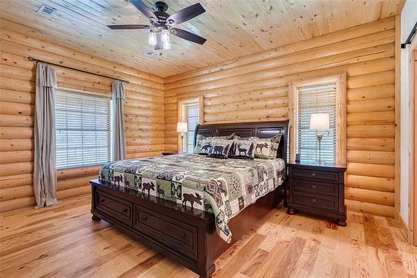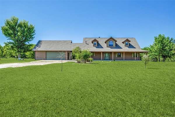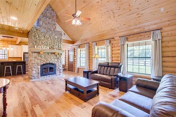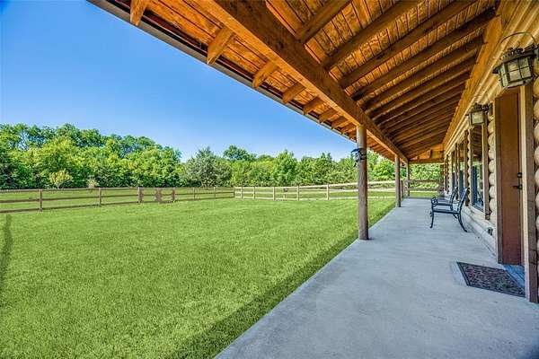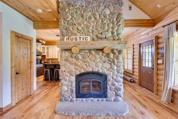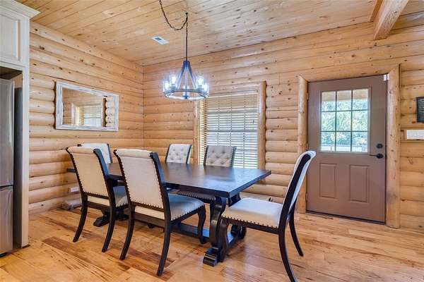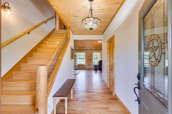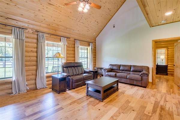 Fall in love with this stunning, custom-built log home tucked away on 7.6 heavily wooded acres -- perfect for horses, cattle, and anyone seeking privacy and natural beauty. A winding creek, expansive views, and tranquil surroundings set the stage for this rare retreat. Step inside to a dramatic open floor plan featuring a grand entry, soaring ceilings, and gorgeous solid hickory floors throughout. Walls of windows bring the outdoors in, filling every room with natural light. The heart of the home is an enormous family room centered around a two-story stone fireplace -- a perfect place to gather and unwind. The gourmet kitchen is a chef's dream, outfitted with a Viking six-burner cooktop, double ovens, granite countertops, and ample cabinetry. The spacious dining room is ideal for hosting, while the private owner's retreat on the main level offers a peaceful escape with a cozy sitting area, spa-like bath, garden tub, separate shower, and generous walk-in closet. Upstairs, a versatile flex room provides space for a game room, secondary living space or whatever your lifestyle demands. The second level also features two large secondary bedrooms, walk-in closets, and a well-appointed full bath. Outside, enjoy a huge garage with built-in workspace and storage -- ideal for hobbies, equipment, or ranch needs. Whether you're raising livestock, entertaining guests, or simply savoring the peace of nature, this home offers the best of rustic charm and modern comfort.