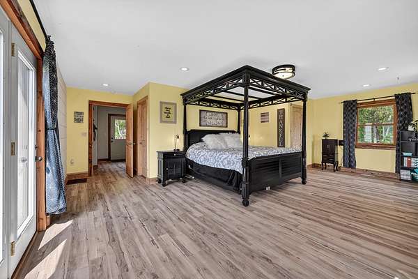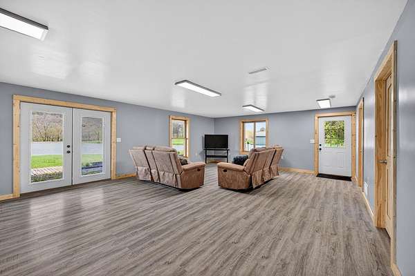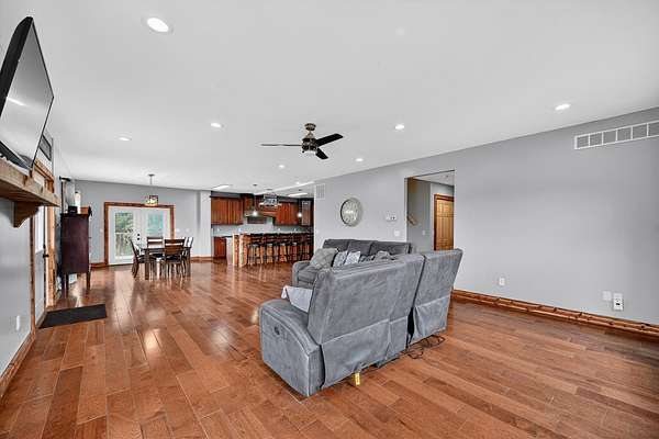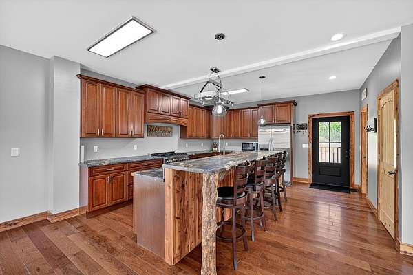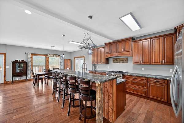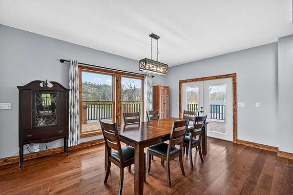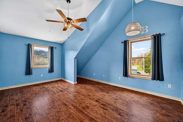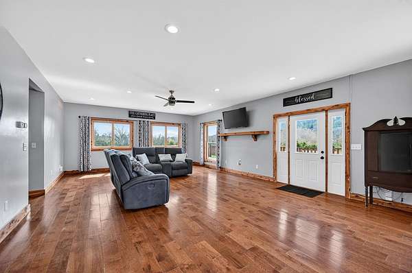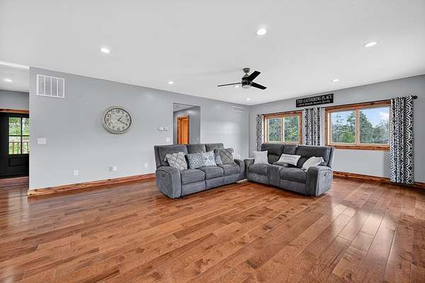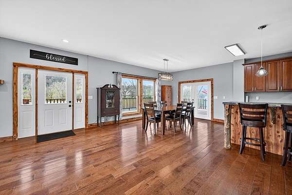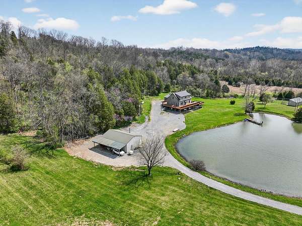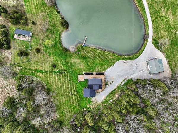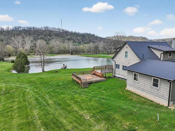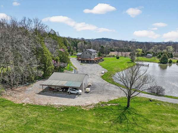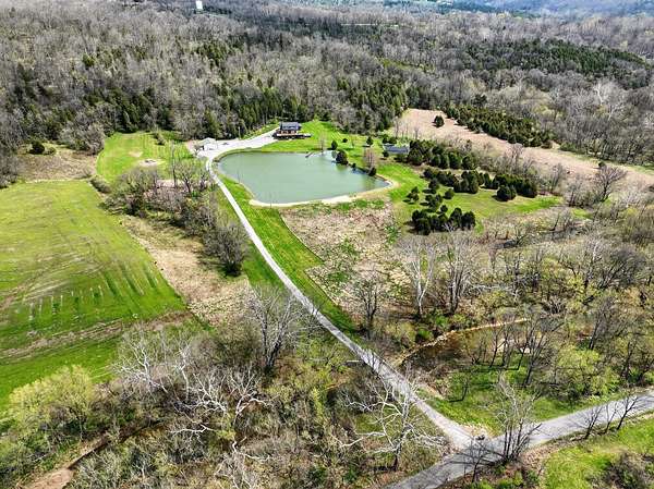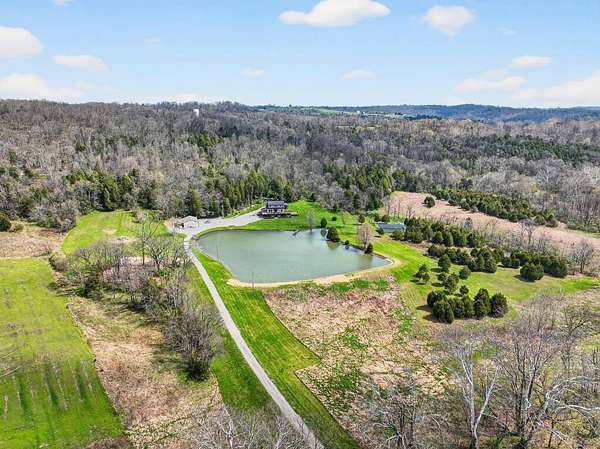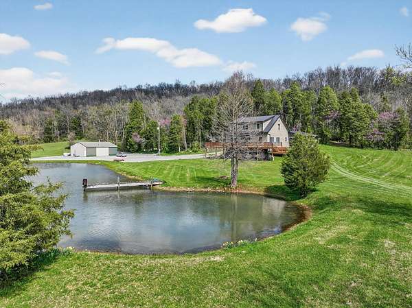 Escape to your own private retreat with this 2-story traditional home nestled on 51 beautiful acres. Tucked away on a private drive, this property offers the perfect blend of peaceful seclusion and modern convenience. Enjoy breathtaking views from the 1,850 sq ft three-sided wraparound porch overlooking a 2-acre stocked pond. The land features approx. 20 tillable acres and 30 wooded acres, complete w/ a creek and a 14x48 highway-grade bridge. This property is truly a hunter's paradise, abundant with wildlife including trophy deer, turkey, squirrel, and rabbit. Inside, the home offers a warm and inviting open-concept layout, with the kitchen and living room perfectly positioned to capture serene pond views. The kitchen is equipped with an island, pantry, gas range, and soft-close cabinets.The home features 4 bedrooms and 2 full baths, including a master bedroom and laundry on the main level. Upstairs is a full bath and 3 bedrooms. Lower level offers another 600+ finished sq ft.