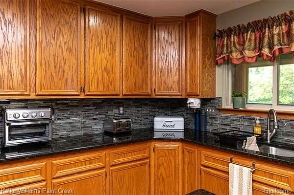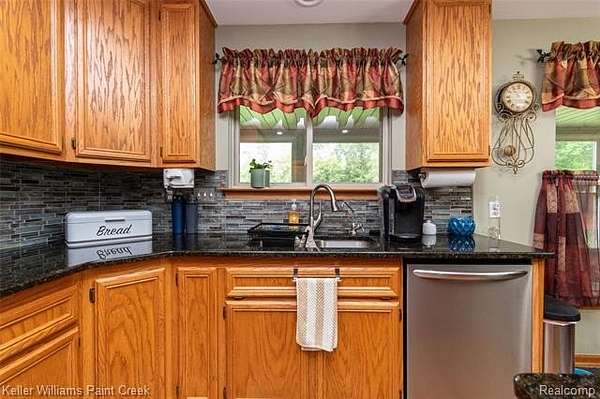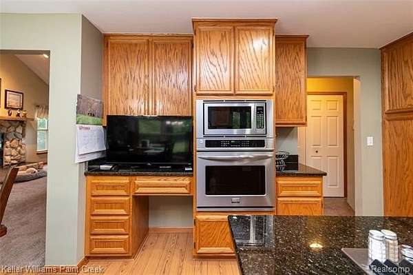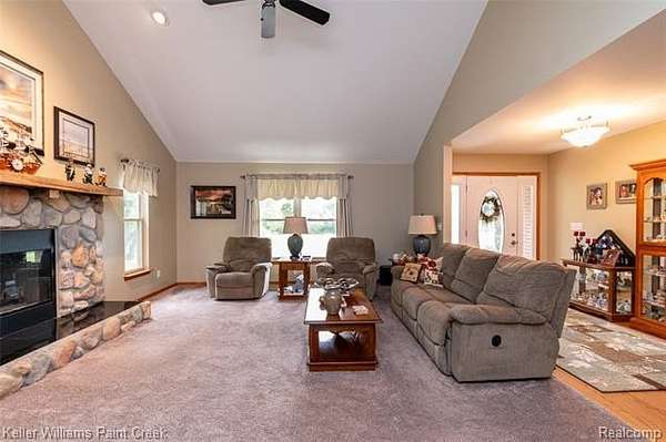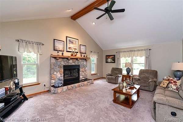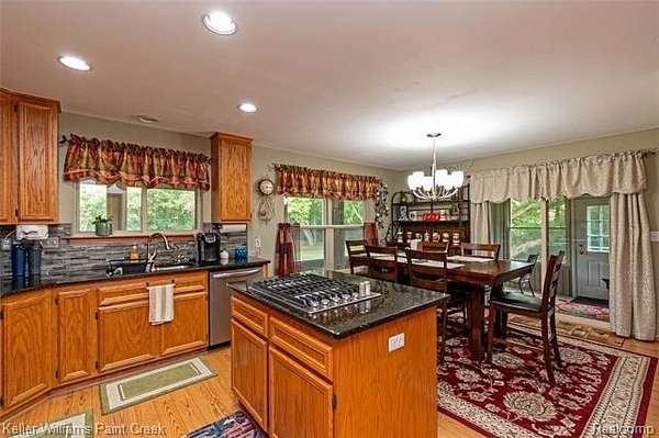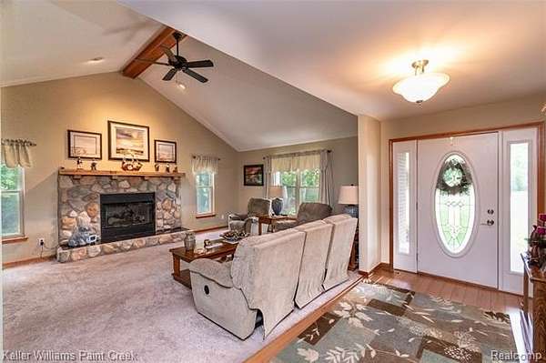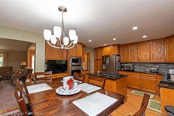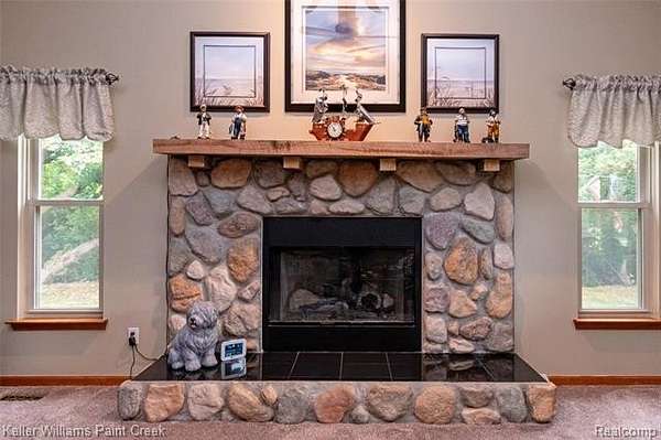 Step into the beautifully remodeled kitchen showcasing granite countertops, a mosaic tile backsplash, and stainless-steel appliances. This space invites both quiet mornings and holiday gatherings. The open-concept Great Room, anchored by a striking fieldstone fireplace, creates a warm, inviting atmosphere where you can find joy in Michigan winters.