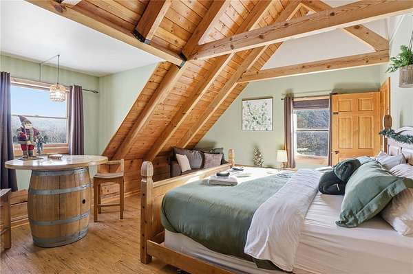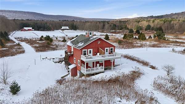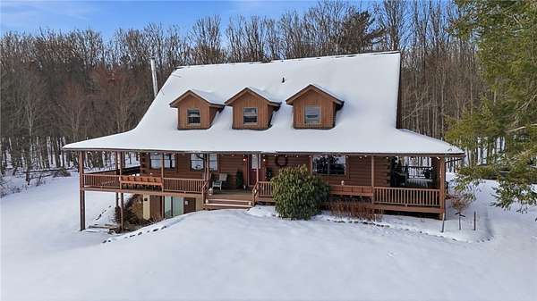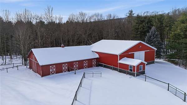 Welcome to The Lodge at Mountain View Meadow (7520 W Hollow Rd) and the Carriage House (7522 W Hollow Rd), both active short-term rentals. The Lodge sits on 28.5 acres and features 4 bedrooms, accommodating up to 12 guests, with an open-concept kitchen and entertainment space on the 2nd floor. A wraparound porch provides the perfect place to relax and enjoy stunning views. The 55x62 indoor arena includes 7 stalls, 4.5 acres of pasture, eight dog kennels, and a 10x15 bonus room, while the pond and surrounding trails can be enjoyed by both guests and owners. The Carriage House, situated on 4.56 acres, is a stunning 2012 build offering 5 bedrooms, each with en-suite bathrooms, along with a lower level featuring a sauna, massage room, and gathering space, plus a wraparound deck with spectacular views. All contents of both properties and the barn will convey with the sale, making this an ideal opportunity whether you are searching for your dream home, a micro-event venue, or a sprawling STR estate that can host up to 22 guests near skiing, hiking, wineries, and the many attractions the Finger Lakes has to offer. Did someone say cost bonus depreciation? Make your 2026 dreams a reality!