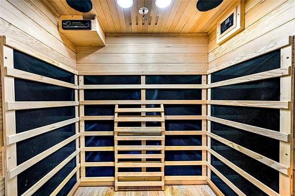 - Built-In Features, Ceiling Fans(s), Eat-In Kitchen, High Ceilings, Living Room/Dining Room Combo, Open Floorplan, Primary Bedroom Main Floor, Sauna, Solid Surface Counters, Solid Wood Cabinets, Walk-In Closet(s)