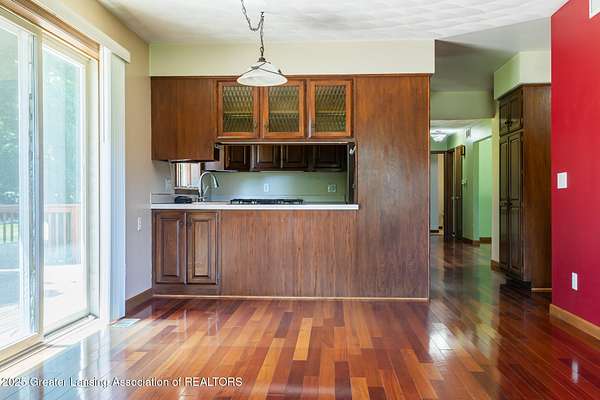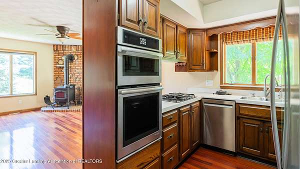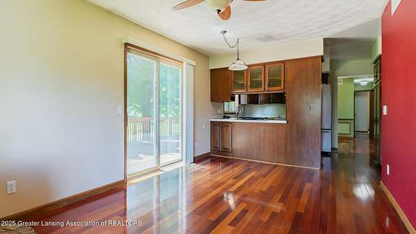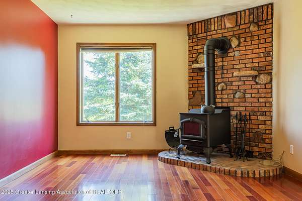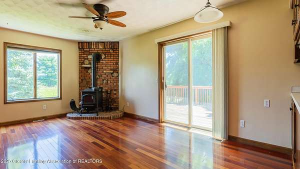 This beautifully maintained ranch-style home sits on just over 2 peaceful acres and features two versatile outbuildingsaEUR"perfect for hobbyists, storage, or additional workspace. Surrounded by scenic countryside, this move-in-ready home welcomes you with an abundance of natural light streaming through large front windows. Gleaming Brazilian hardwood floors flow throughout the spacious living and dining areas, creating a warm and inviting atmosphere. The custom kitchen offers ample pantry space, updated appliances, and a layout ideal for both cooking and gathering. At the back of the home, the cozy family room features a wood-burning stoveaEUR"perfect for those chilly Michigan nights. A sliding door leads to a generous back deck, ideal for entertaining or simply relaxing as you take in in the sights and sounds of nature. The primary bedroom is conveniently located near the full bath and offers plenty of closet space. A second bedroom provides flexibility for guests, a home office, or hobbies. The walk-out basement is mostly unfinished, offering potential for future living space or extra storage.