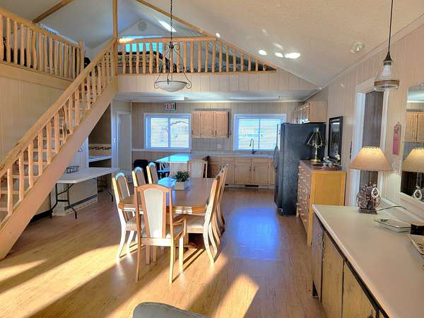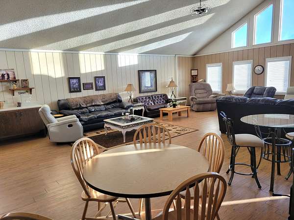 The second part of the property has the 70'x120? barndominium. This spacious building features a second floor (that is approximately 1400 sq. ft.) 3 bedroom, 2 bath apartment with a high efficiency furnace, which is in process of a full remodel. The downstairs kitchen has a commercial stove hood and dishwasher and the attached dining/game room is a great flex space. The multi-purpose section of the building was once a gymnasium and still features the basketball hoops. Currently the space is used for building material storage with a section in the back sectioned off for winter workshop activities. This area can be accessed through a large overhead door. There are also two bathrooms with showers on the ground floor. The building is insulated and a steel pro-panel is installed on the inside to provide a maintenance free surface.
