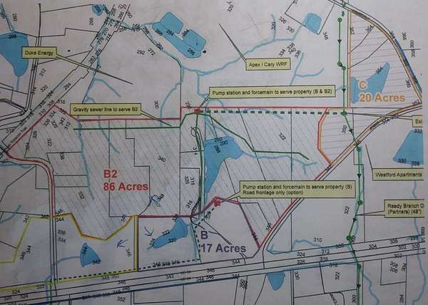 Attention Developers! This highly desirable 3.196 acres is part of a 48.85 Land Assemblage (possible 108.59 acres) located at the corner of Jenks Road and Hwy 64 West. Water and main sewer line extremely close, will require a pump station. Apex 2045 Land Use Map is Office Employment / Commercial Services. Future Interchange planned to be built over Hwy 64. See MLS# 2359660 - 2359665. See Documents for Apex Planning Dept Info