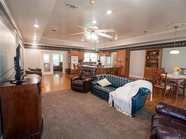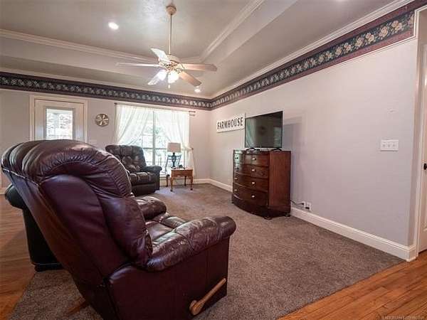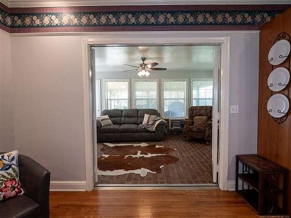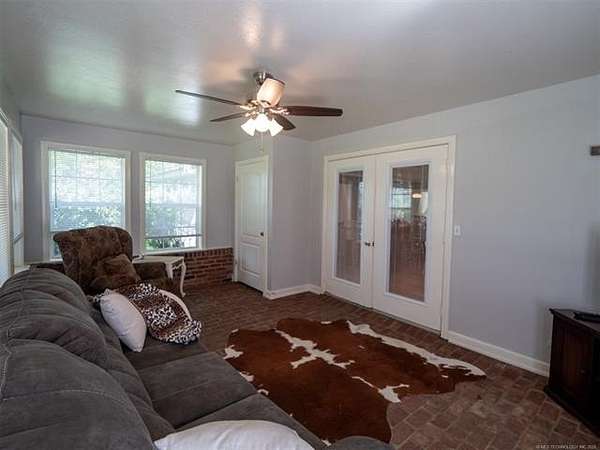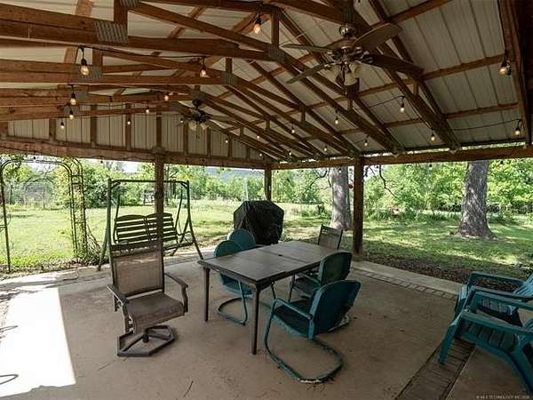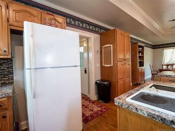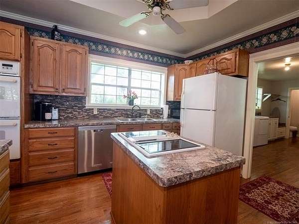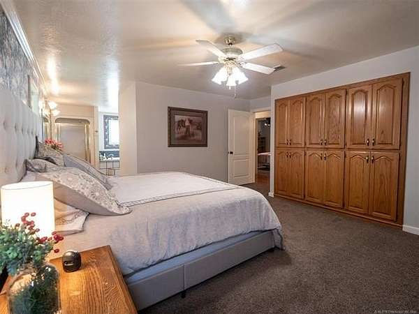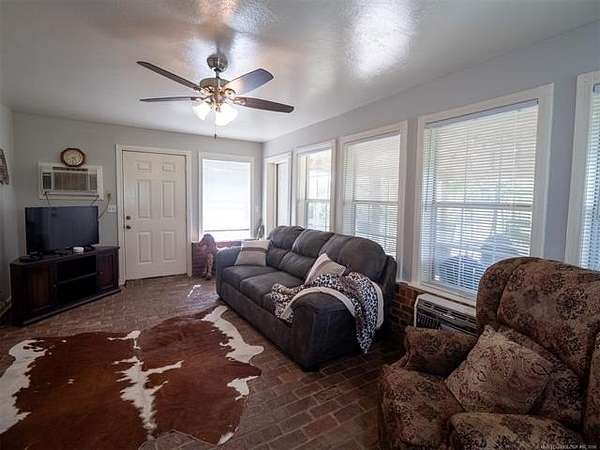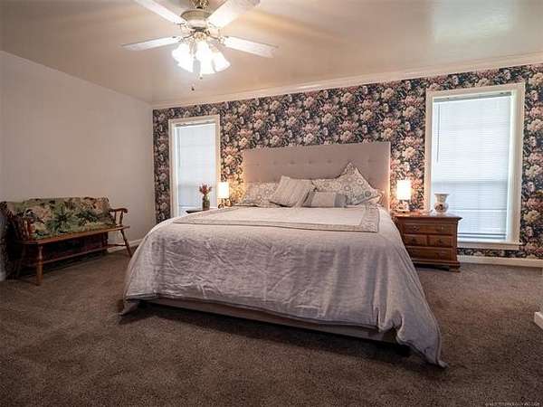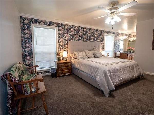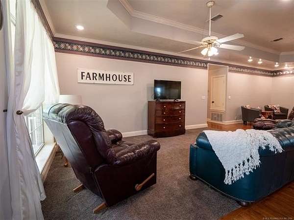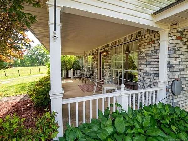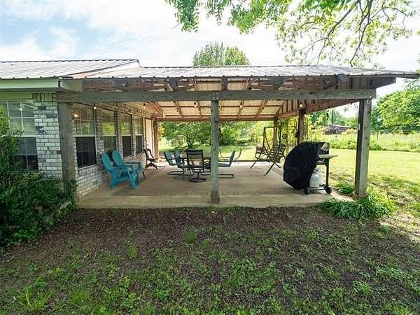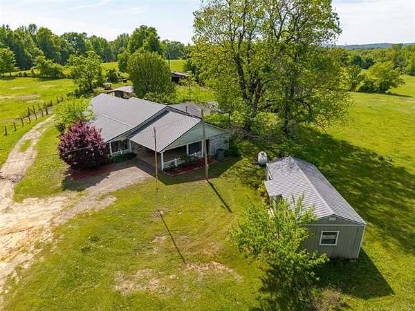 This stunning custom-built home features 3 bedrooms and 2.5 baths, set in a peaceful country setting that offers both comfort and tranquility. The open-concept kitchen and living area include oak cabinets with pull-out shelves, providing ample storage and functionality. The spacious layout is ideal for entertaining family and friends. Fresh interior paint in 2023 gives the home a bright, updated feel throughout. The master suite is designed for relaxation, featuring a jacuzzi tub, a large walk-in closet, and built-in storage drawers. Each additional bedroom also includes a walk-in closet, with one offering a cozy reading nook-perfect for quiet moments. A sunroom off the back of the house provides a serene space to enjoy natural light and views of the property. Just outside the back door, a safe room offers added peace of mind. Extending from the back of the home is a 20' x 21' covered patio-an inviting outdoor space perfect for gatherings, dining, or simply relaxing while taking in those beautiful Oklahoma sunsets. The home is equipped with two heat pumps (installed around 2017) and a termite treatment system for year-round comfort and protection. Outdoor features include two ponds, a carport with a work area, a 16x32 insulated and heated shed, a barn, and a hay barn. The property is serviced by both rural water and a well, with fiber optic internet ready for hookup. A perfect blend of modern comfort and country living-ready to welcome its next owner home.
