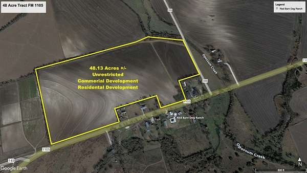 UNRESTRICTED 48 +/- acre property in the middle of one of the fastest growing areas in the USA, Located only 1.75 miles off of Highway I-35, it has great access and almost 1500 feet Frontage on FM 1105 and 1000 feet Frontage on County Road 388, Industrial, Housing, RV Park, Warehousing, etc. This is a phenomenal location for numerous of different developments either commercial and residential opportunities, The property is also just a mile and a half away from the newly built GTX Logistics Park Project on highway FM 972, With the vast growth occurring around the area, possibilities for this property are endless, Don't miss your this opportunity