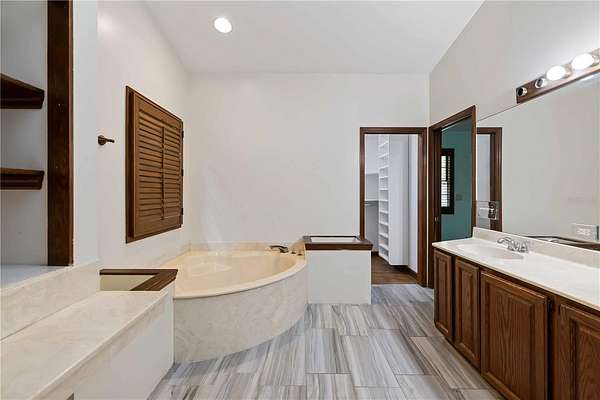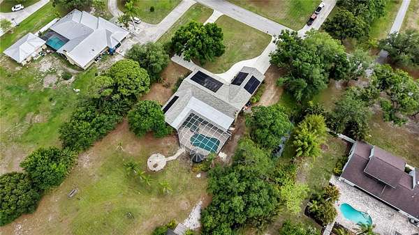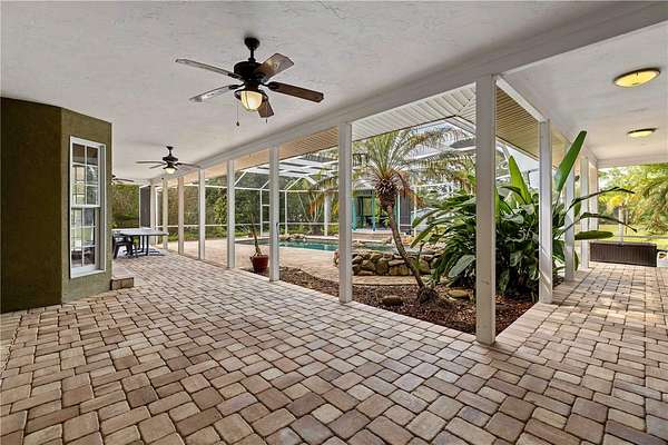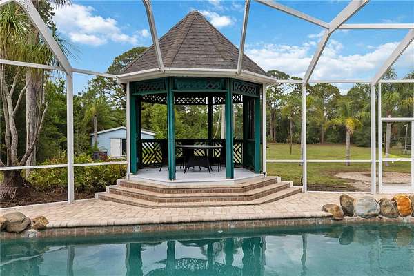 Now, imagine the ultimate outdoor paradise. An oversized pool and tropical hot tub anchor the expansive screened-in area. An L-shaped covered section intertwines with an over-the-top gazebo, providing ample shaded space for lounging or hosting. Sun-drenched areas flow seamlessly into the two-acre lot, creating a truly tropical entertainer’s dream.
