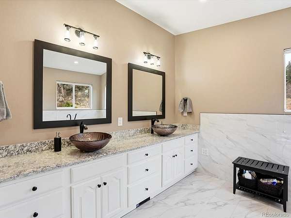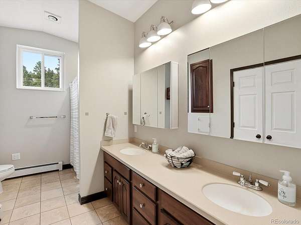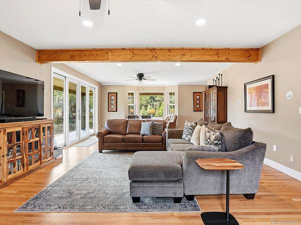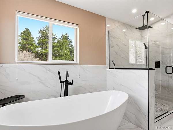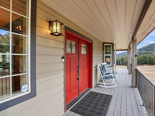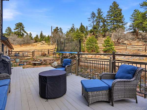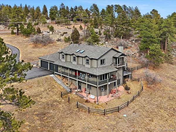 Big views, fresh mountain air, and a wraparound porch that practically demands morning coffee - this is mountain living! Welcome to The Homestead, one of the foothills’ most sought-after neighborhoods, where mountain views, spacious homesites and a friendly community atmosphere meet an easy commute to Denver. This home's expansive wraparound front porch invites you to slow down and enjoy true Colorado living, with peaceful meadow views and frequent wildlife sightings on the 2.58 acre lot. Fresh exterior paint and a newer roof provide great curb appeal and added peace of mind. The home offers spacious rooms and thoughtful updates throughout. The main level features a welcoming living room with a stately fireplace, a formal dining room for hosting gatherings and a convenient main-floor guest suite. The kitchen is designed for both everyday living and entertaining with stainless steel appliances, double ovens, hardwood floors, and casual dining space. Upstairs, the primary suite serves as a true retreat with its own private deck showcasing breathtaking mountain views, a remodeled spa inspired five piece bath and two walk in closets. Two additional bedrooms and a full bath complete the upper level. The finished walkout basement offers a complete second living space with its own entrance, second kitchen, living area with fireplace, bedroom, full bath, laundry and flexible living space, ideal for multigenerational living or long term guests. Car enthusiasts and hobbyists will appreciate the heated four car garage with workshop space. The landscaped yard blends trees, meadow and open space to create a peaceful mountain setting. Located near parks, trails, and outdoor recreation, this Homestead property offers the best of foothills living with no HOA and convenient access to Highway 285 for an easy drive to Denver!