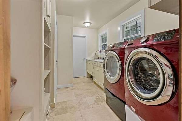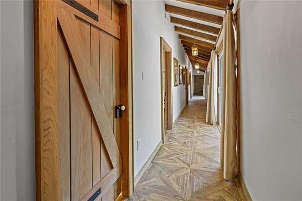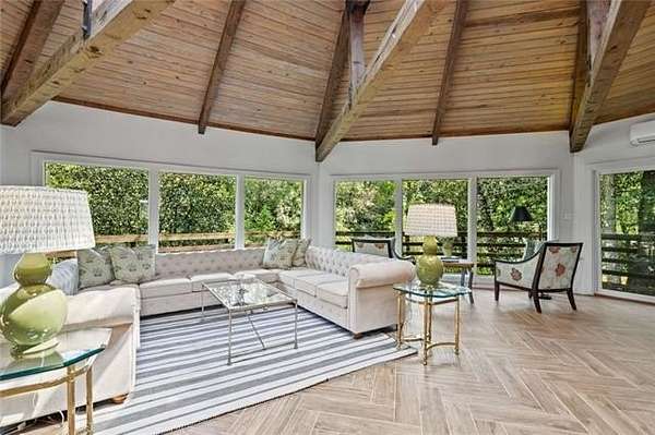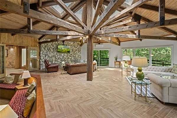 The main residence features 5 bedrooms and 4 baths all on one sprawling level, w/ a thoughtfully designed separate guest wing accessed by a striking hallway with wood-beamed ceilings, patterned wood tile floors, lantern lighting, and sliding doors opening to the pool area. The chef's kitchen is a true showpiece with a 10-burner Lacanche range, Sub-Zero refrigerator, and oversized island. The highlight of the home is the stunning 1,200 sq ft great room encased in glass w/ soaring vaulted 15' ceilings with custom wood beam design and panoramic views of the river. It also features multiple seating areas including a built-in fireplace nook.