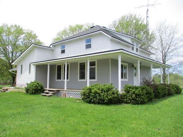 This meticulously updated two-story farmhouse with 5 bedrooms & 2 1/2 baths with 2.46 acres with many quality improvements including new flooring, drywall, fresh paint, wiring, lighting, roof, windows and siding. The kitchen is the centerpiece of the home with elegant granite counters, cabinets, pantry, stylish backsplash, stainless steel appliances & hood vent. Electric heaters with room thermostats were installed in some rooms.2 bedrooms, 2 full baths and laundry are on the main floor.The stair railings are easily removed. Ample storage in the basement, 2-car garage, shed and big red barn. The wrap around covered porch is perfect for relaxing.Includes all appliances plus 1 year home warranty. Occupancy is at closing. Come to discover all the possibilities this property offers. Call today!