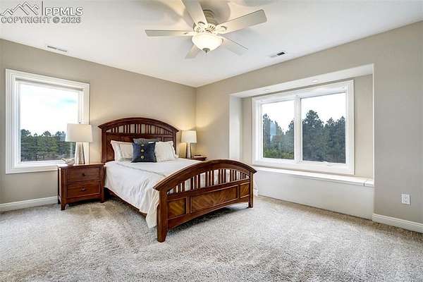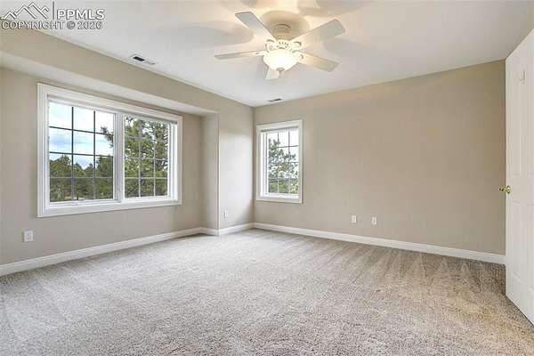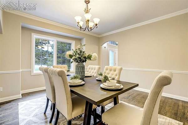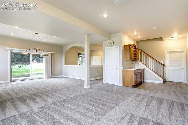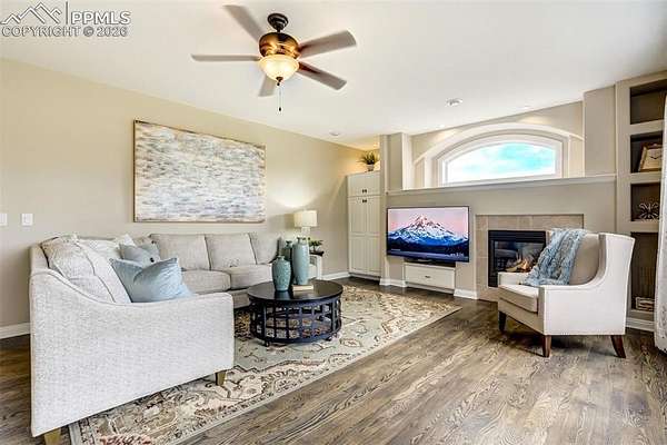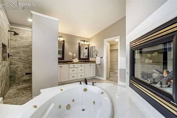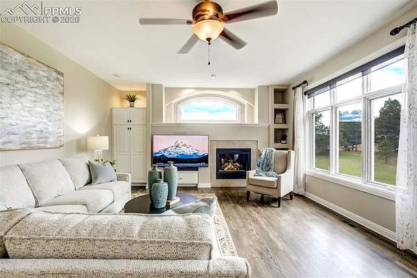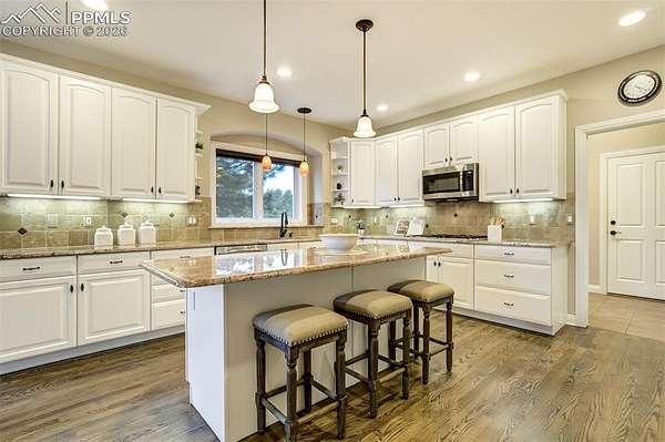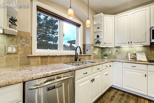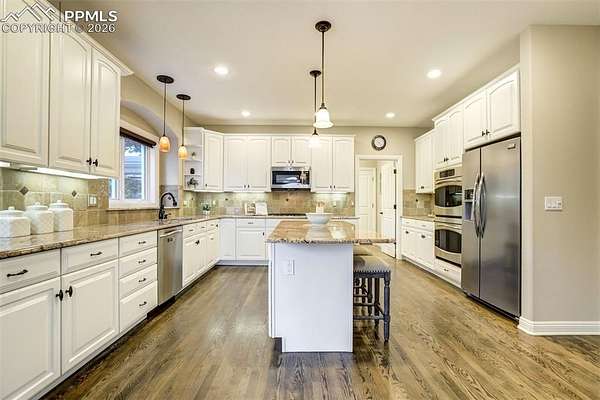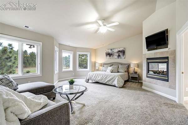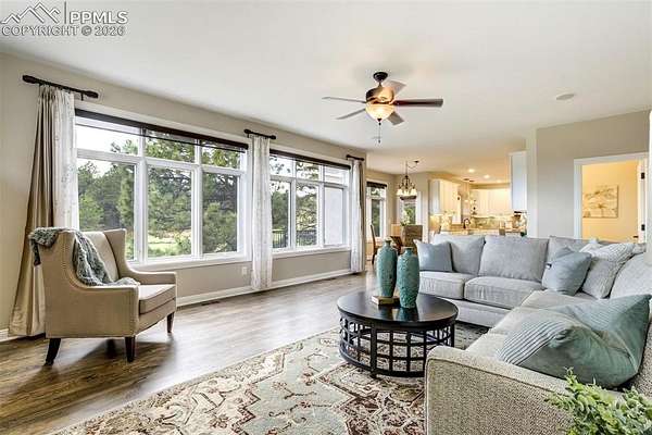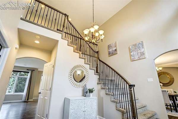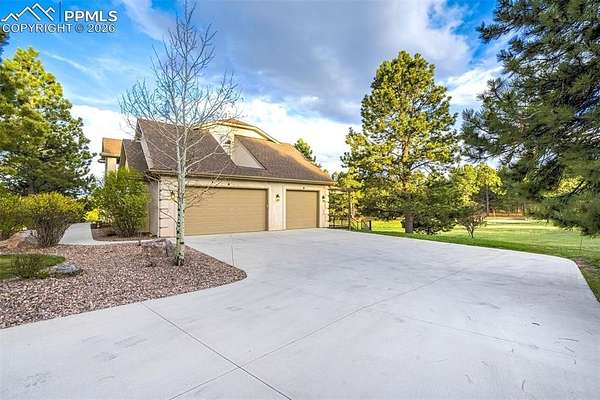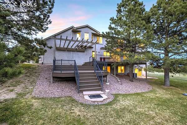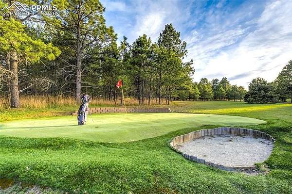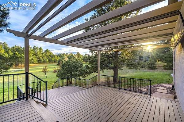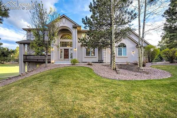 Set within the prestigious pine-covered community of Kings Deer, This home offers a rare blend of luxury, privacy, and resort-style living on a beautifully manicured, deep lot surrounded by mature trees. A grand foyer with a sweeping curved staircase welcomes you into refined interiors featuring hardwood floors, fresh paint, and thoughtfully designed spaces. The main level includes a spacious office, formal dining room, and an open-concept kitchen with island, breakfast nook, and walkout to the expansive multi-level Trex deck with retractable shades. The backyard is a true highlight-featuring a private putting green with sand trap, lush lawn supported by valuable additional water rights, and exceptional privacy among the pines. Upstairs offers four bedrooms, including a luxurious primary suite with sitting area, see-through fireplace, spa-like bath with soaking tub, walk-in shower, dual vanities, and a large walk-in closet. Secondary bedrooms include a Jack-and-Jill layout and an additional en-suite. The walkout basement is ideal for entertaining with space for a rec room, lounge, pool table, wet bar, and a tiled fitness area. Recent upgrades include a new Class 4 impact-resistant roof, two new A/C units, new basement carpet, and a whole-home water filtration system. The oversized three-car garage features custom cabinetry and a workbench, while the double-thick concrete driveway provides durability and ample guest parking.