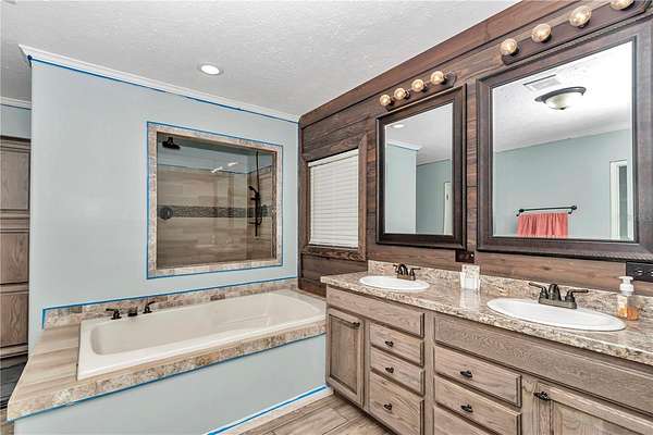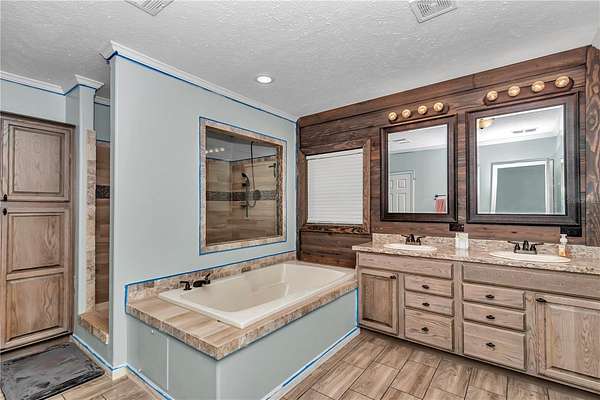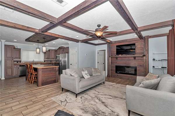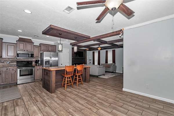 INTERIOR FEATURES: Gorgeous fireplace. Kitchen with unique butcher block countertops - deep stainless steel sink & appliances, ample cabinetry, and a breakfast bar, perfect for casual dining or entertaining guests. Master suite is a true retreat, complete with a walk-in closet and a luxurious en-suite bathroom featuring dual sinks, a soaking tub, and a separate walk-in shower.
