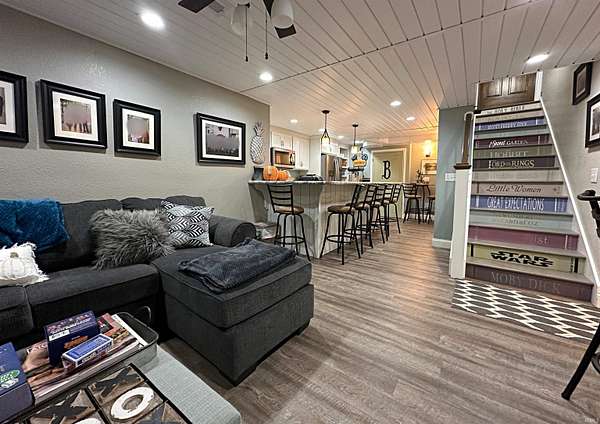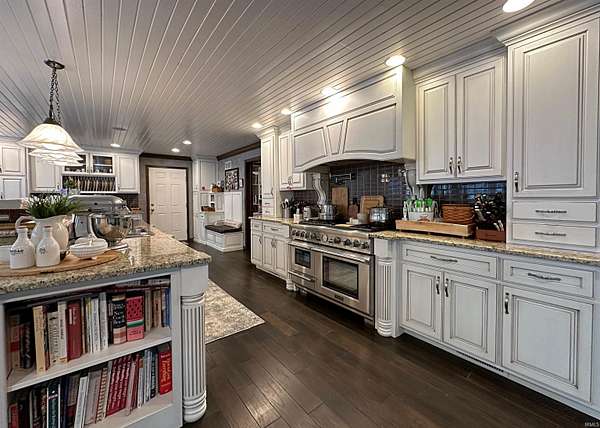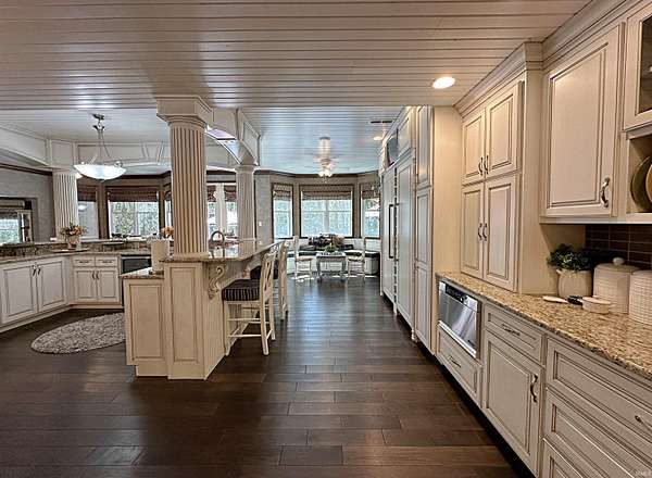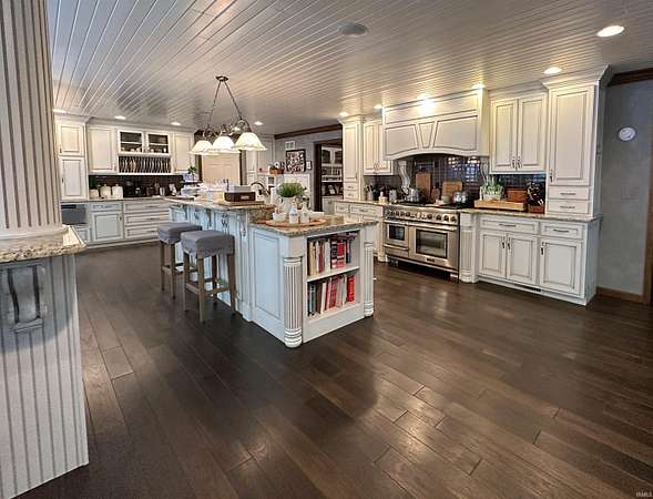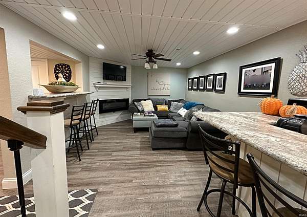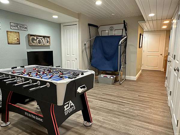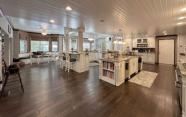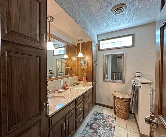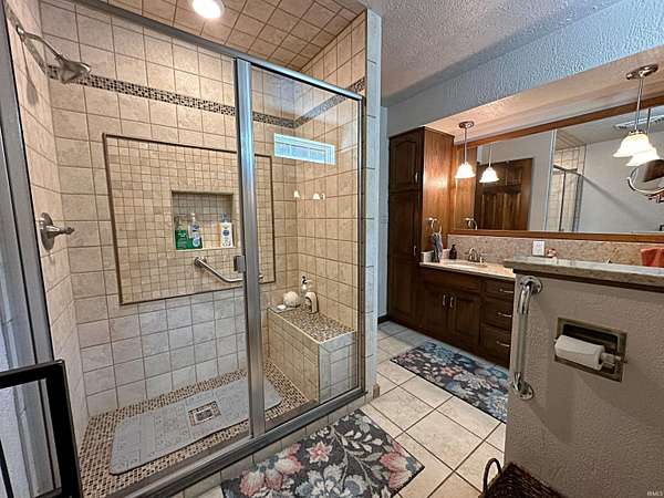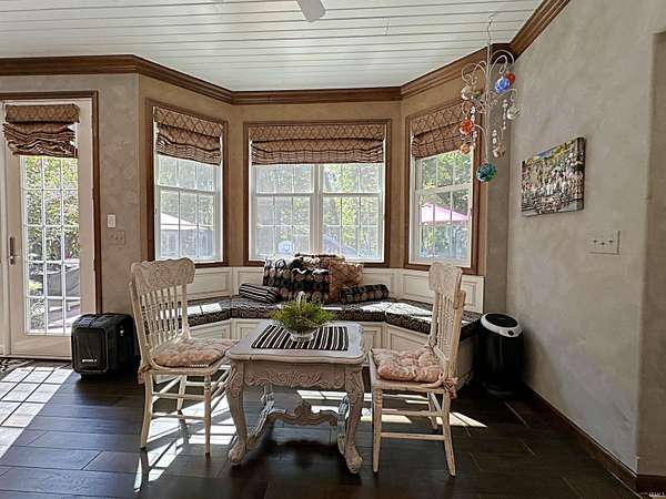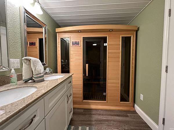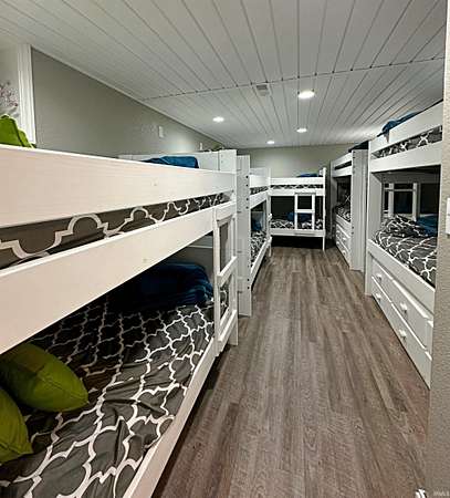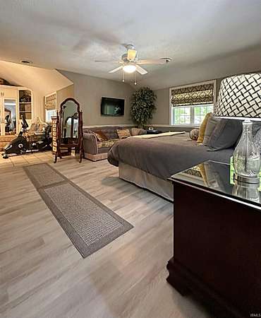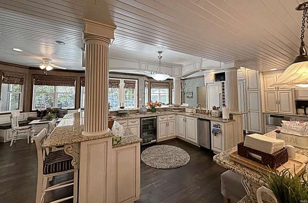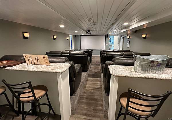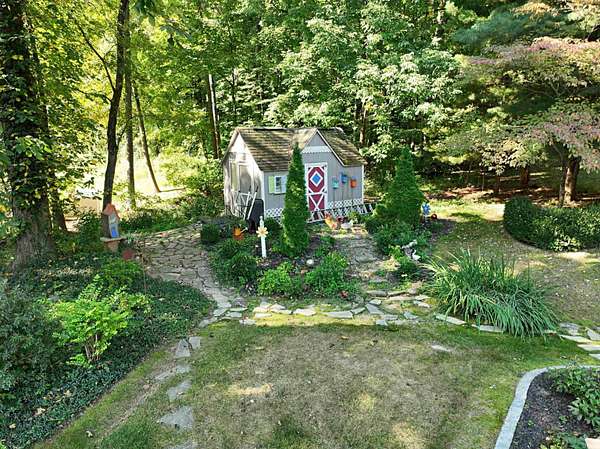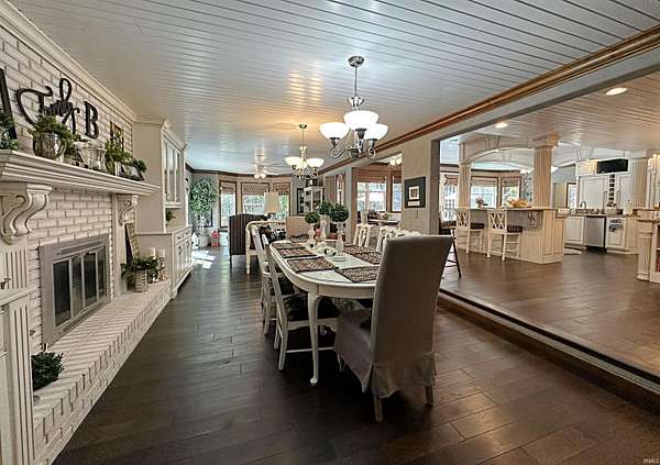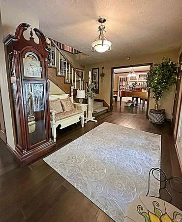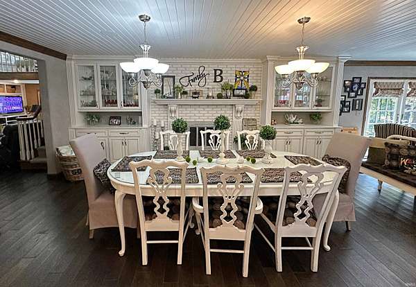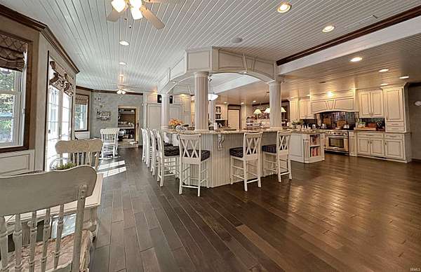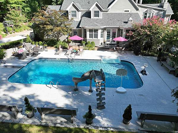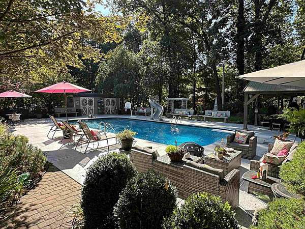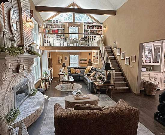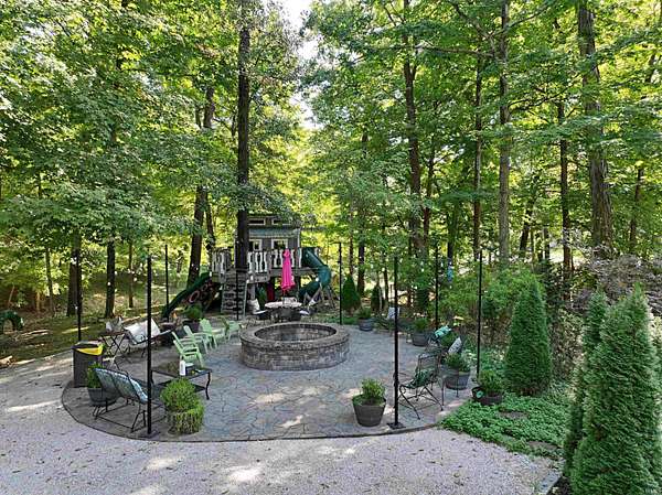 Welcome to this remarkable two-story home, located in the prestigious Sugarland Heights Subdivision, that seamlessly blends timeless elegance with modern living. Nestled on two wooded acres +/-, this property greets you with a sweeping half-circle driveway, manicured landscaping, and stately curb appeal. Step inside to a grand foyer with hardwood floors and custom millwork. The 7,000+ sq ft home opens to expansive living and dining areas, highlighted by a two-story great room with exposed beams, a lofted library overlook, and a striking floor-to-ceiling brick fireplace. At the heart of the home is a chef's kitchen featuring custom cabinetry, granite countertops, professional-grade appliances, and oversized islands with seating. The adjoining dining area, anchored by a fireplace and built-in cabinetry, sets the stage for memorable gatherings, while a sunlit breakfast nook with banquette seating offers cozy charm. The main level also includes a music room, half bath, large laundry room, and full bath. Upstairs, spacious bedrooms provide comfort and flexibility. The primary suite is a true retreat with a private sitting area, mirrored dressing room, walk-in closet, and a spa-like bath featuring dual vanities, a large tiled shower, and a corner soaking tub. Additional bedrooms are equally inviting, with ample closet space and natural light. The finished lower level is designed for leisure and fun, offering a full kitchen and bar with counter seating, lounge and recreation areas, a cinema room with tiered leather seating, custom bunk room perfect for guests or kids, a sauna and full bath for relaxation, plus a game room with space for foosball, darts, and more. Step outside to your private resort-style escape. The large in-ground, heated pool, complete with slide and basketball hoop, is surrounded by expansive patios, colorful landscaping, and multiple lounge areas. A rustic wood-beamed pavilion with a hot tub offers shaded seating and outdoor dining, perfect for gatherings large or small. The in-ground trampoline, large tree house with slide, and fire-pit area is an outdoor dream. From elegant interiors to endless entertainment spaces, this home offers sophistication, comfort, and lifestyle all in one extraordinary package.