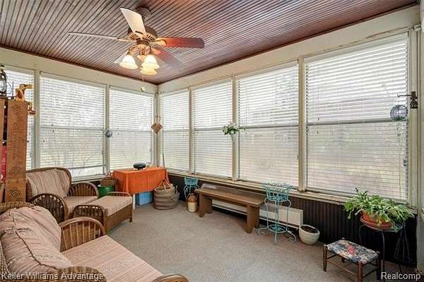 The custom-designed, updated kitchen blends charm and function with wood cabinetry, granite countertops, and a farmhouse sink. A gas fireplace creates a cozy focal point in the living room, while a bright three-season room provides the perfect space to relax and enjoy the natural surroundings year-round.