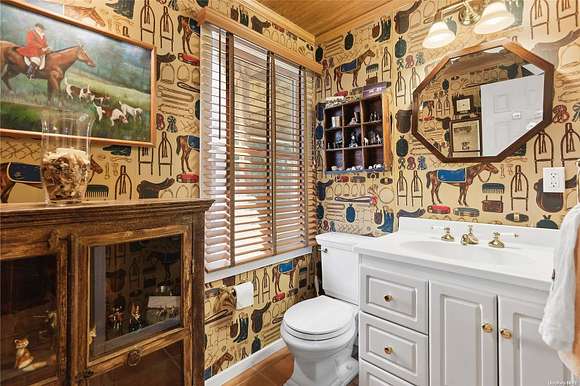 This enchanting property offers a tranquil retreat on approx. 2.33 acres in Southampton and Water Mill's picturesque horse country. A gated entrance welcomes you to lush, park-like grounds featuring a heated saltwater pool, a pool house, expansive patio and deck areas, and beautifully maintained gardens. Inside, you'll find a country kitchen, a bright sun-filled living room with double-height ceiling and a fireplace, a formal dining room, a bonus room or den, and a full basement. The unique powder room reflects a polo-inspired design. A breezeway connects to a two-car garage, while the sumptuous primary suite above boasts a private balcony overlooking the serene backyard. Don't miss this bucolic oasis in the Hamptons.