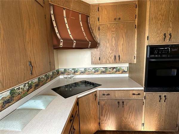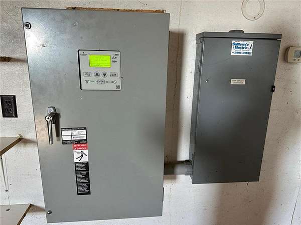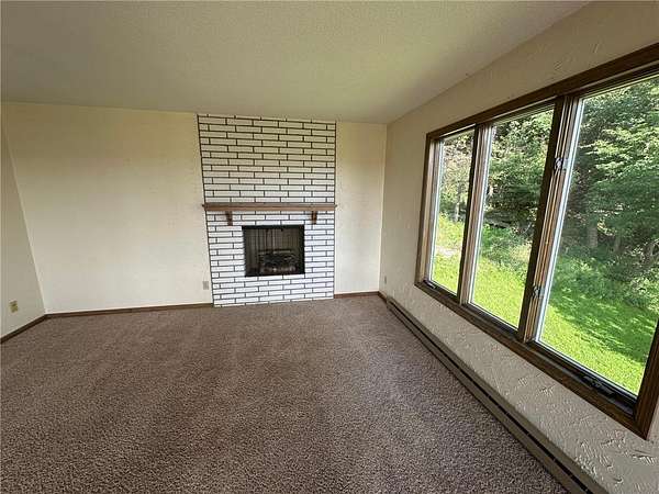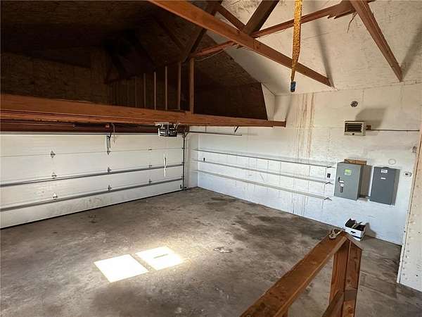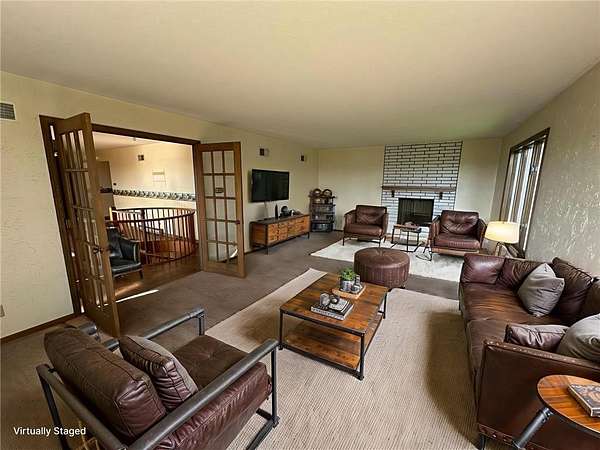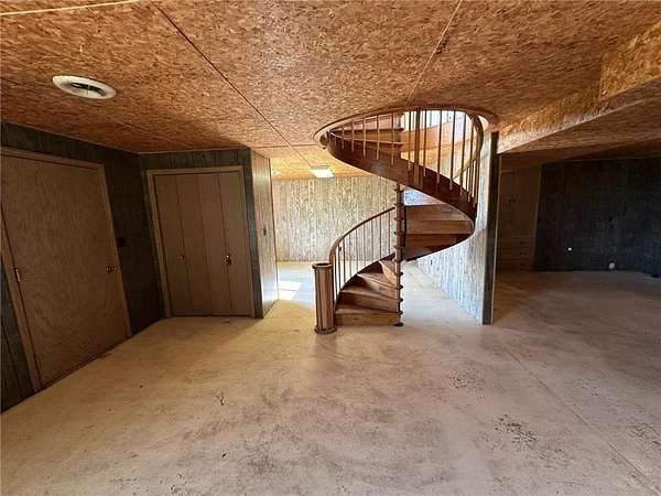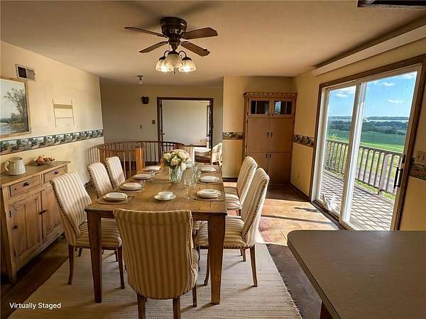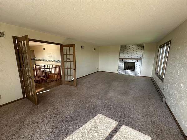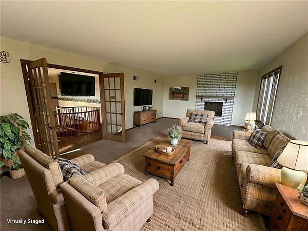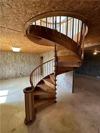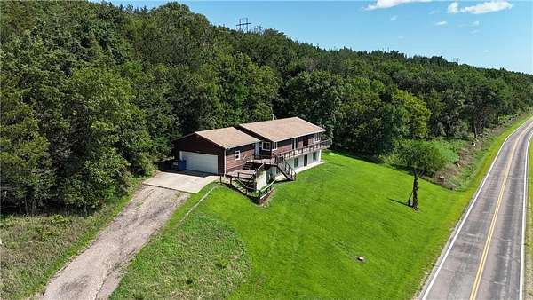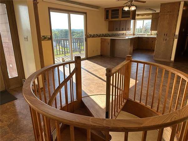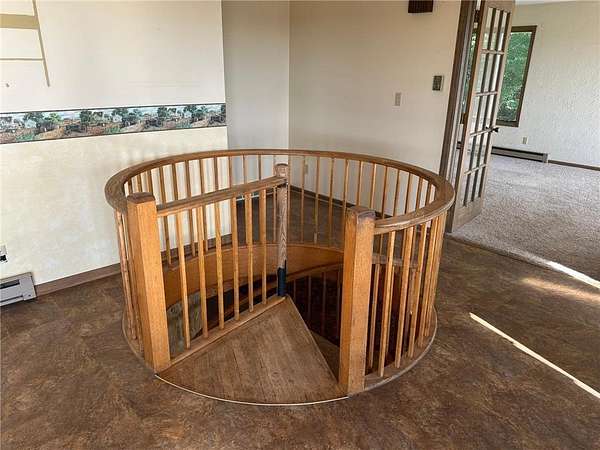 The home features a custom wooden spiral staircase as the centerpiece of the kitchen and dining area, a wood-burning fireplace, and several windows framing the spectacular river bottom prairie. A double attached insulated and heated garage provides comfort year-round, while a whole-house backup generator ensures peace of mind.