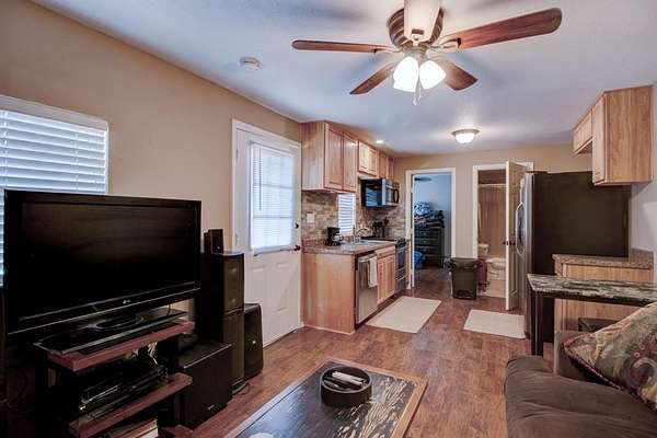 Two homes on almost 2 Acres! Spacious manf. home 3 bed, 2 bath, open floor plan, fireplace with gas logs in LR with a rock face. The kitchen is open to living and dining area, so while prepping snacks for family and friend you will never miss a beat. Walk in closets, built ins, AC vents in ceiling not the floor. Large windows in the living area, lets in load of natural light. Or sit and watch the kiddos, fur babies add some goats, chicken, ponies or put in an above ground pool. Enjoy the covered space with friends and family at summer time BBQ's. The possibilities are endless with this home and property, set up a horseshoe pit, play cornhole, build a cute circle pergola with swings and a fire pit. The tiny house could be used as an in law suite, guest house, or keep as monthly income. Tiny home brings in a whopping $1200.00 per month income. This will not last long, schedule a viewing today!