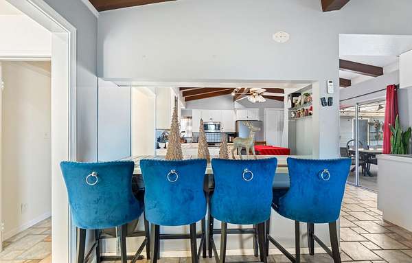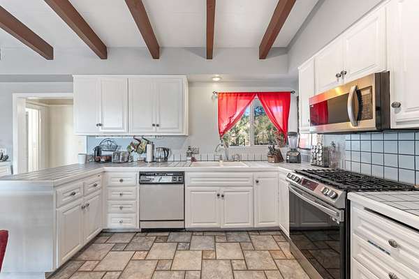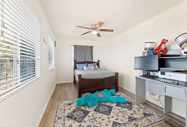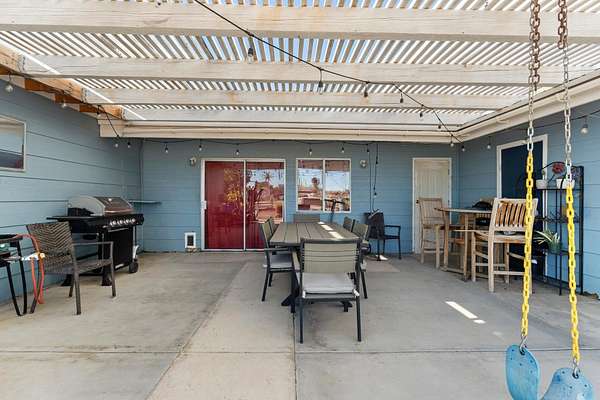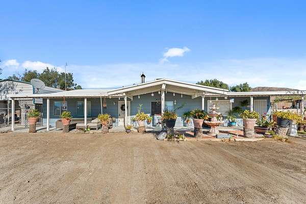 Welcome to a remarkable 5-acre ranch-style retreat offering stunning 360 degrees mountain and desert views. This 2,000 sq. ft. home features 3 bedrooms and 2 bathrooms, a country-style kitchen with breakfast bar, tiled flooring, beamed ceilings, and a cozy wood-burning stove. A 60-ft covered front porch creates the perfect setting for enjoying vibrant sunsets, moonlit nights, and starlit skies, making this property both peaceful and picturesque. The property is designed with versatility in mind, featuring RV parking, a covered carport and work area, plus two 40-ft storage containers for added convenience. Zoned for agriculture and equestrian use, it's ideal as a private ranch, creative retreat, or Airbnb investment. Whether you envision a serene getaway, horse property, or unique desert lifestyle, this home delivers unmatched privacy, space, and rustic charm.