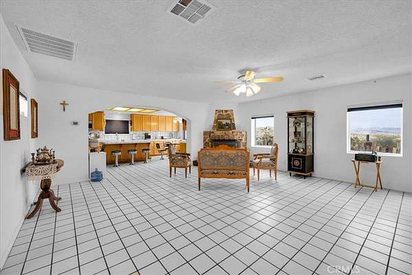 Originally built in 1946 with thick adobe construction, the main residence features two bedrooms and two bathrooms, expansive living areas, and a large kitchen with extensive cabinetry and counter space. Multiple gathering rooms center around a stone fireplace, and large windows frame desert and mountain views.