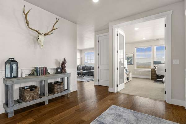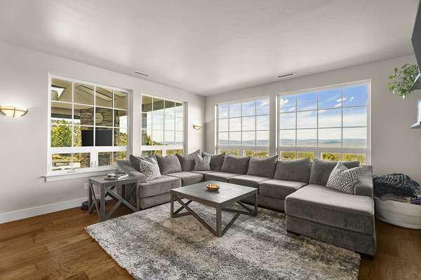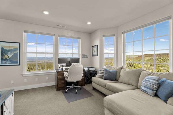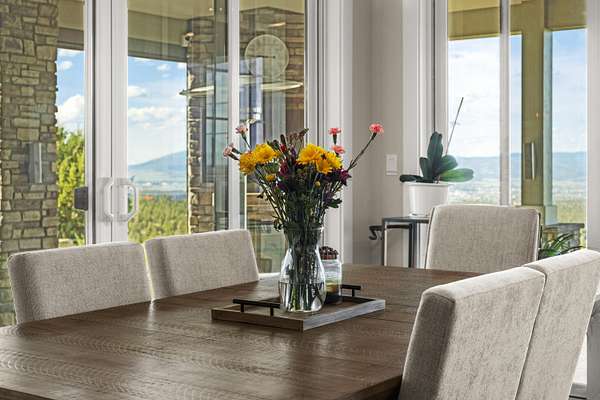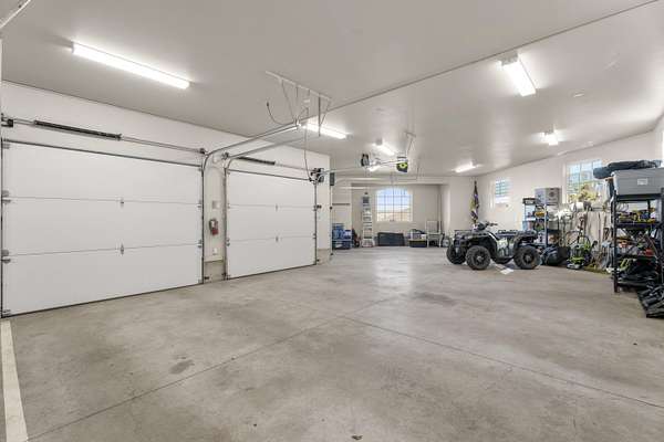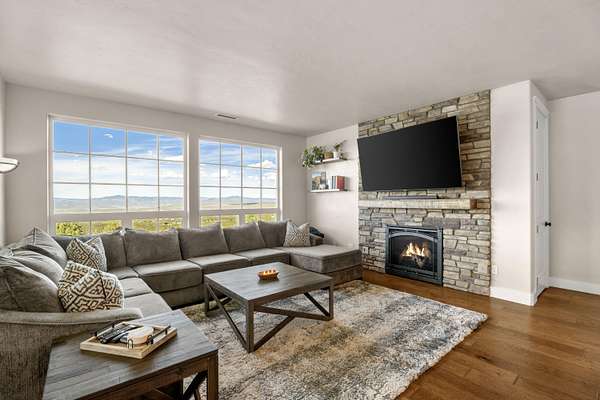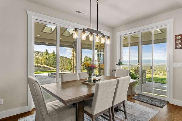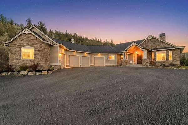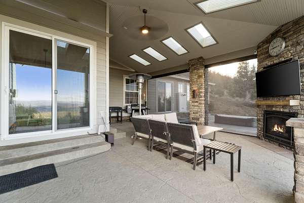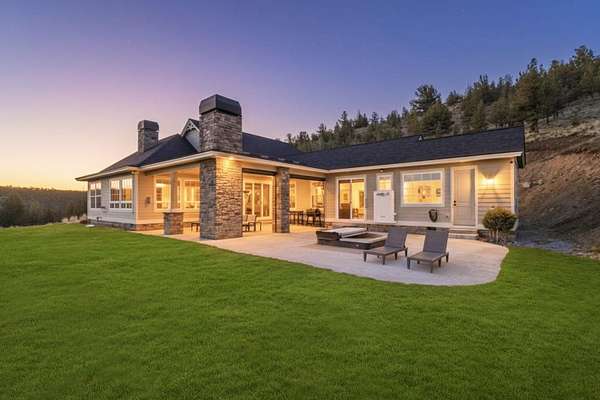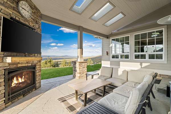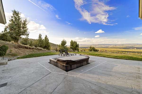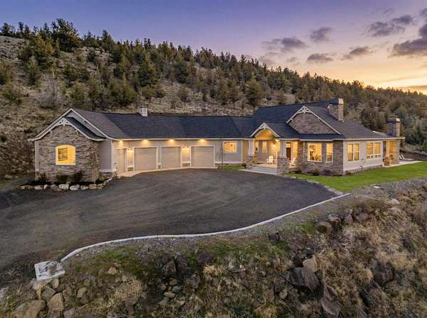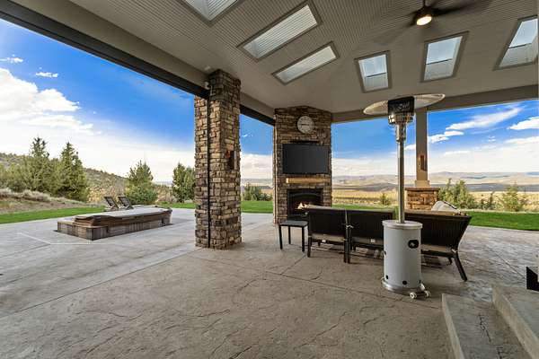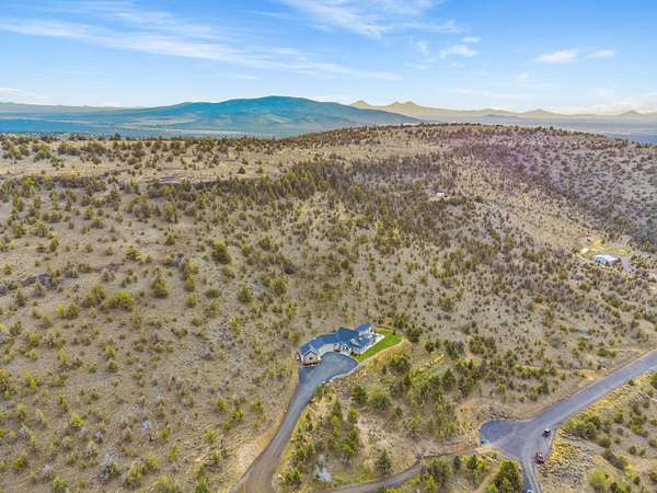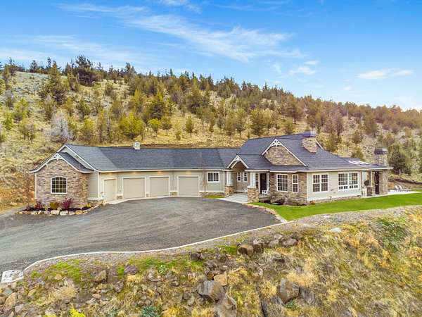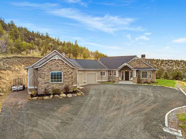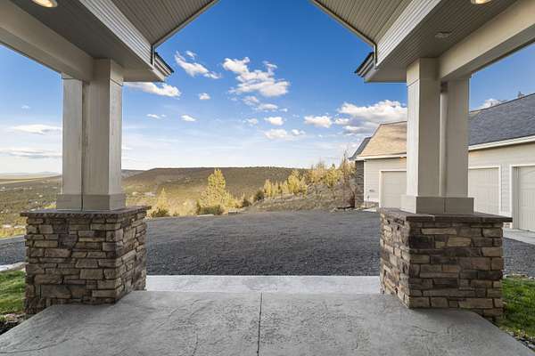 Stunning custom home perched atop a private hill with panoramic views of the entire valley & Prineville. This home showcases an elegant stone-covered entrance opening into a formal entry, spacious office/4th bedroom & open living area framed by windows accentuating natural light. Stone gas fireplace anchors the great room, gourmet kitchen features granite counters, large island, oak cabinetry, pantry, drink bar, & dining area. Primary suite has a soaking tub, walk-in tile shower, & private slider to patio. Library room with fireplace & custom built-ins, 2 bedrooms with Jack-&-Jill bath. Incredible covered Lanai provides the ultimate entertaining space with a fireplace, TV, automatic shades, custom lighting, stamped concrete patio with heat around large in-ground hot tub, outdoor shower, bathroom, & mechanical room for future pool. 2,000sf 4 car garage with heat, A/C, air compressor connect, full bath & upstairs bonus space. Phenomenal sunrises & sunsets, backing up to 514 acres of BLM.