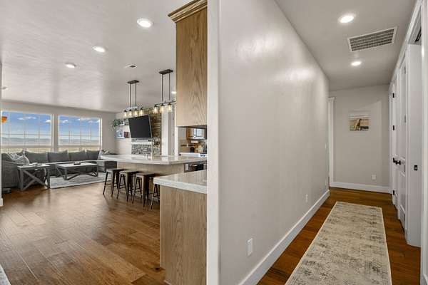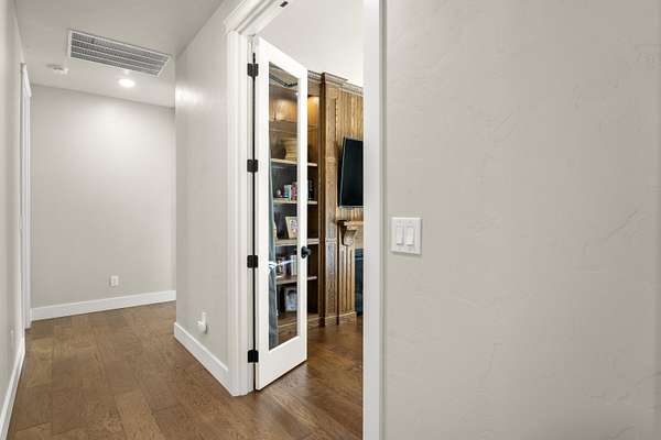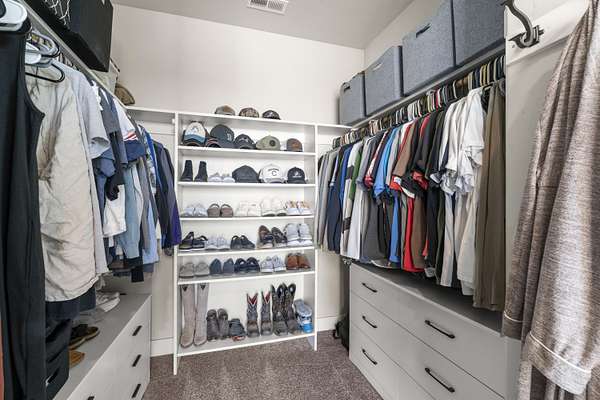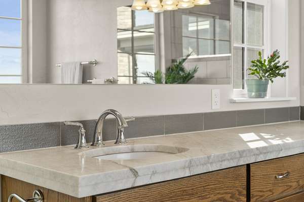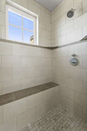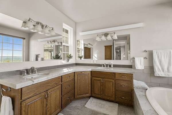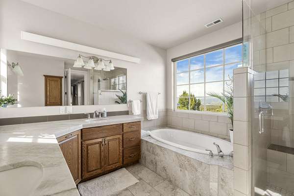 - Breakfast Bar, Built-In Features, Ceiling Fan(s), Double Vanity, Enclosed Toilet(s), Granite Counters, Kitchen Island, Linen Closet, Open Floorplan, Pantry, Primary Downstairs, Shower/Tub Combo, Soaking Tub, Solid Surface Counters, Tile Shower, Vaulted Ceiling(s), Walk-In Closet(s)