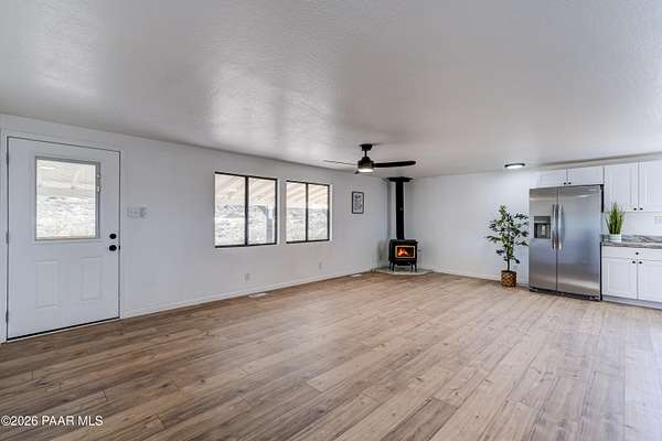 VIEWS VIEWS VIEWS! Tucked away on 2.85 fully fenced acres with a private gate and unparalleled scenic views backing to national forest, this beautifully updated, fully remodeled, turnkey 3-bedroom, 2-bath home offers space, privacy, and versatility. The 1,274 sq ft layout is thoughtfully designed and packed with upgrades, blending modern comfort with peaceful country living.Inside, you'll find gorgeous, one-of-a-kind granite countertops and a matching granite hearth framing a cozy wood-burning fireplace--a true focal point of the home. Nearly everything is NEW, including floors, vents and ducts, ceiling fans and fixtures, interior and exterior paint, cabinets, toilets, and a full suite of appliances (refrigerator, dishwasher, and stove), plus new heat and A/C for year-round comfort.The home features three bedrooms, including a small walk-in closet, and two full baths. A bonus room off the front porch and pantry in the kitchen are both already equipped with 220V, with the pantry set up for a stackable washer and dryer. Outside, the property includes an RV dump (no water or electric hookups yet), with water lines nearby and 220V already in place, making future hookups easy to add.Step out onto the new deck and enjoy a freshly improved backyard with stunning views and direct access to nature. For equestrian lovers, the property truly shines with excellent horse facilities, including metal stalls with cover, all within the fully fenced acreage. This property puts you seconds from riding directly out into national forest and enjoying the thousands of acres of trails!Water is conveniently provided by a community water company with reliable service and great rates. With new pavers, expansive land, and unmatched surroundings, this move-in-ready property offers a rare opportunity to enjoy modern upgrades, outdoor freedom, and serene national forest views--all in one exceptional home.