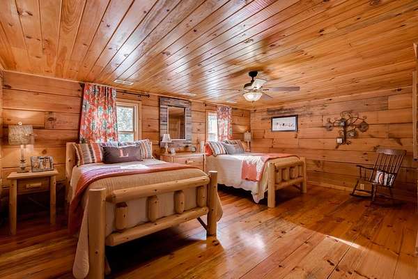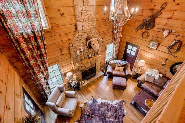 The main log cabin features 4 spacious bedrooms and 3.5 baths, highlighted by a gorgeous stone fireplace, granite countertops, and beautiful hardwood and tile floors throughout. Designed for comfort and entertaining, the home boasts three covered porches, perfect for enjoying peaceful views and outdoor living year-round.