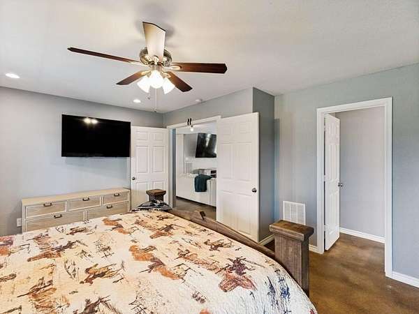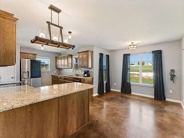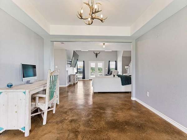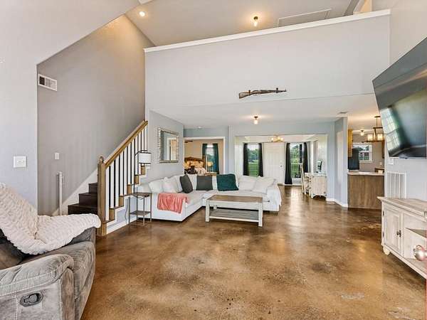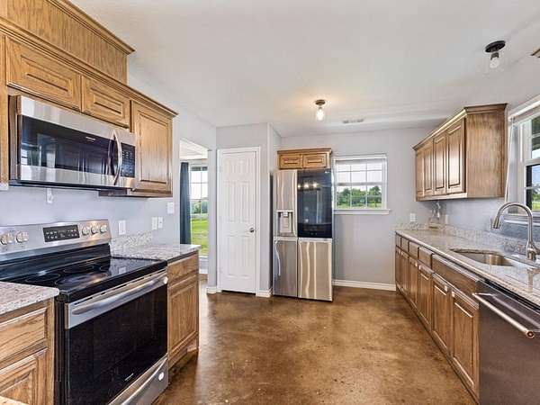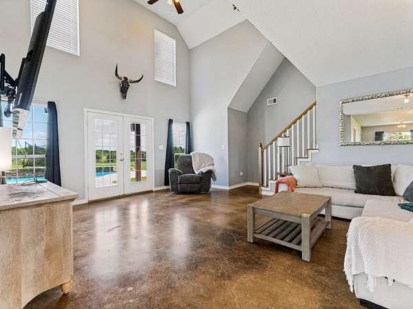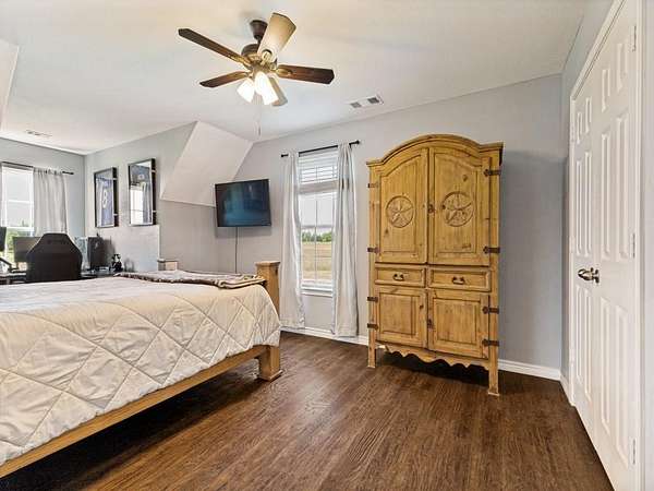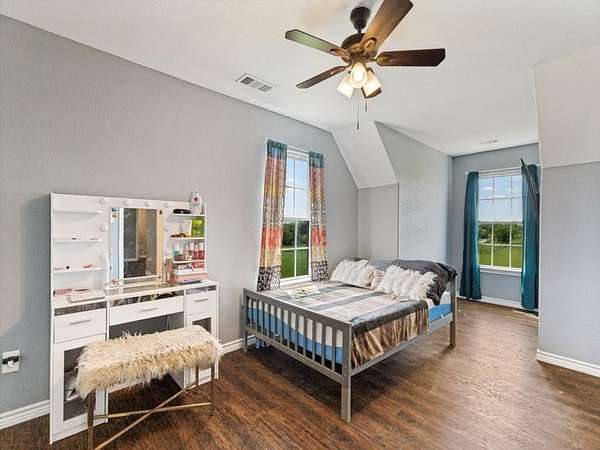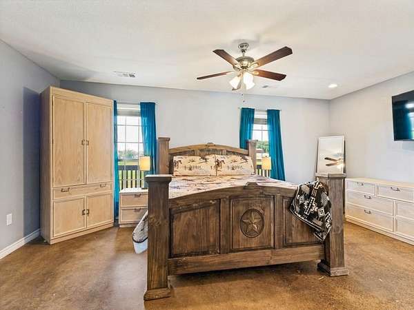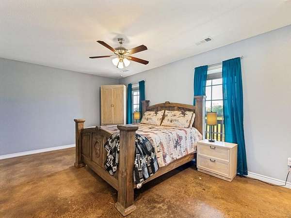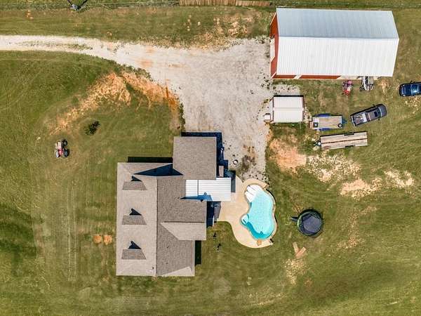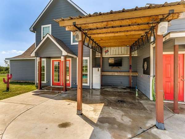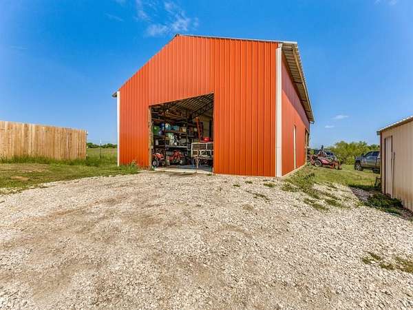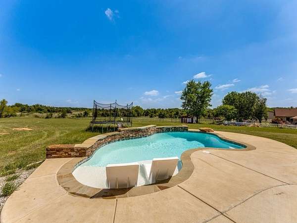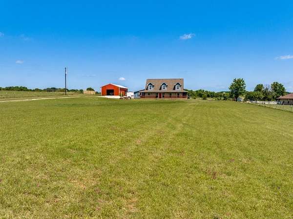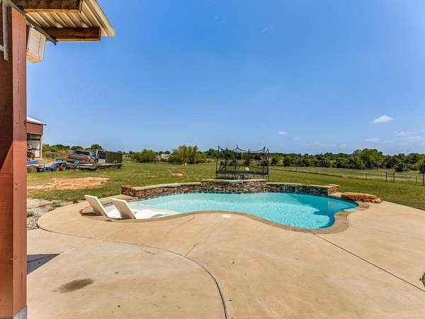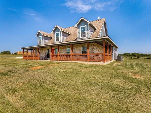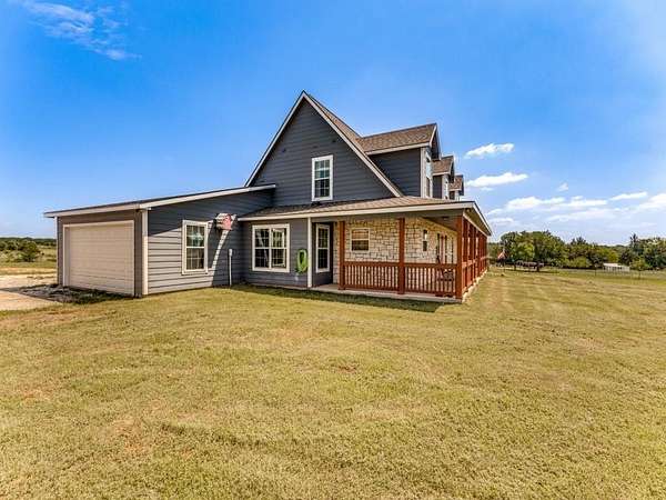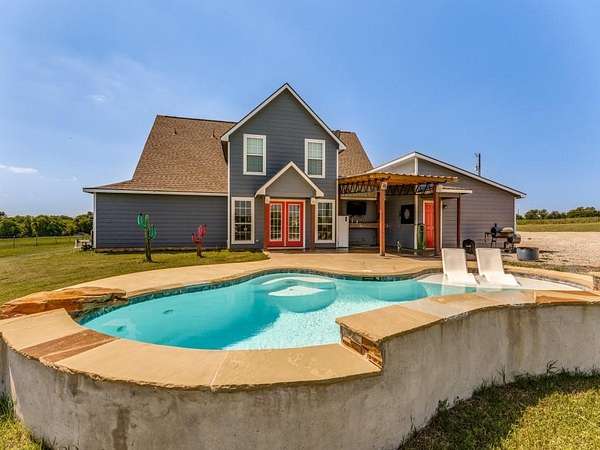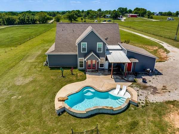 Beautiful custom build farmhouse on 4 acres with private pond. Welcoming wraparound front porch and then enter into the spacious open floor plan with stained concrete flooring and plenty of windows and natural lighting. Great flow into the kitchen with stainless steel appliances, eat-in breakfast bar and dining area. The downstairs primary bedroom with ensuite bathroom features dual walk-in closets, garden tub, double vanity sinks and huge tiled separate shower. Upstairs you have a spacious loft dividing the two large bedrooms with a full bath and half bath with luxury plank flooring throughout. Walk into the back yard to enjoy lounging around the new pool featuring 3 waterfalls, a tanning ledge and in-pool cocktail table. All this and a 60x30 workshop barn. Great for entertaining or just relaxing in your little piece of the country! Paradise ISD. Septic system was just pumped and serviced in April. Refrigerator, washer, dryer and safe are negotiable. Showings begin 04-27-26.