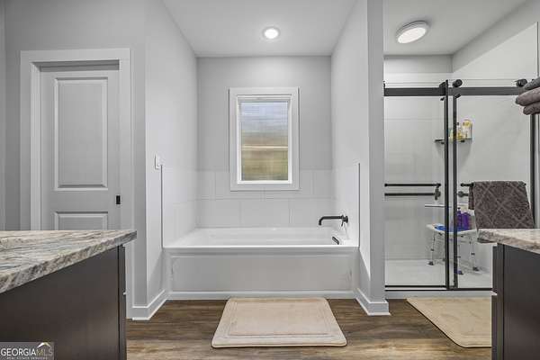 - Double Vanity, High Ceilings, Separate Shower, Soaking Tub, Split Bedroom Plan, Vaulted Ceiling(s), Walk-In Closet(s)