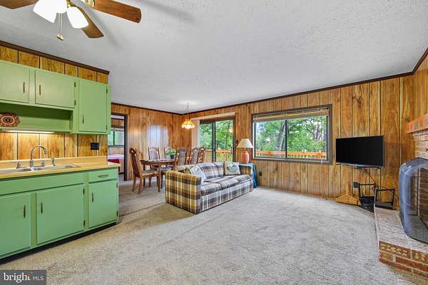 - Carpet, Dining Area, Entry Level Bedroom, Family Room Off Kitchen, Open Floor Plan, Tub Shower Bathroom, Wood Stove