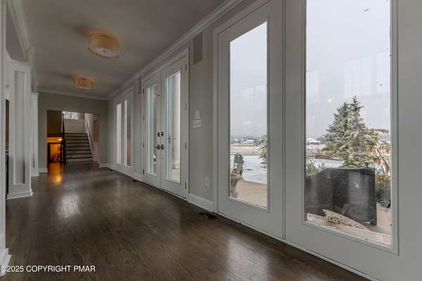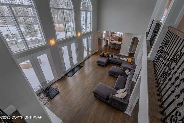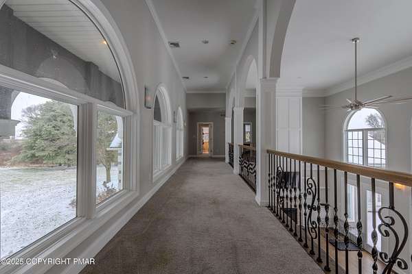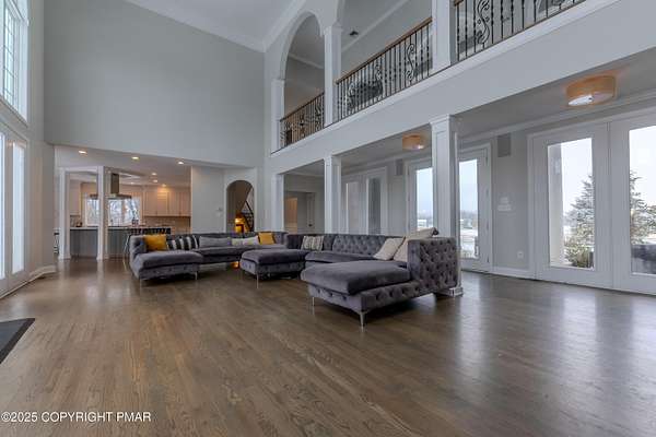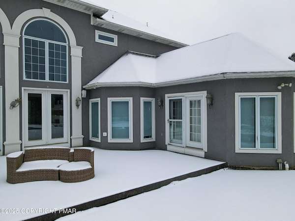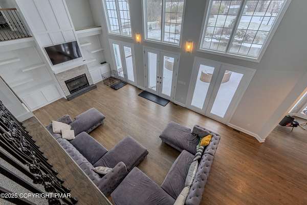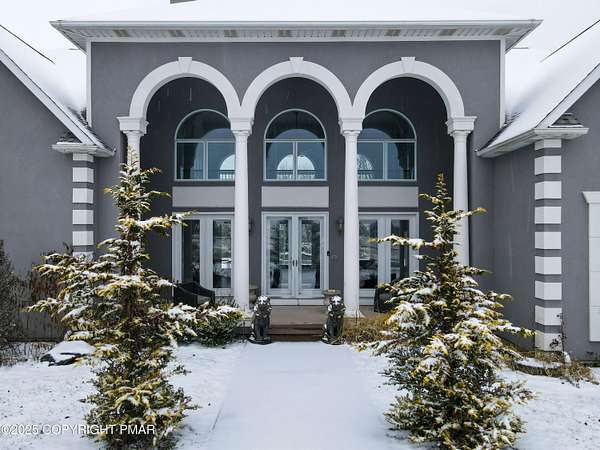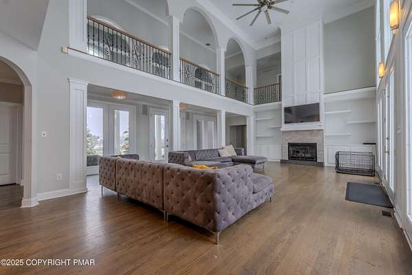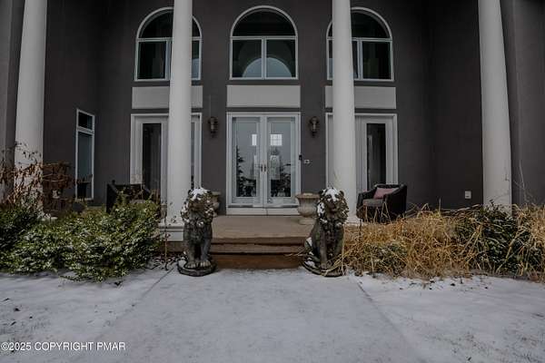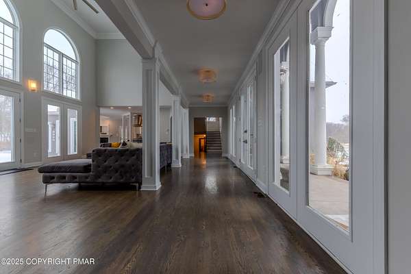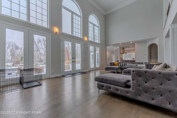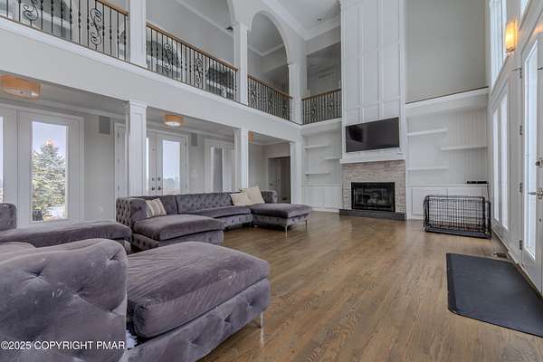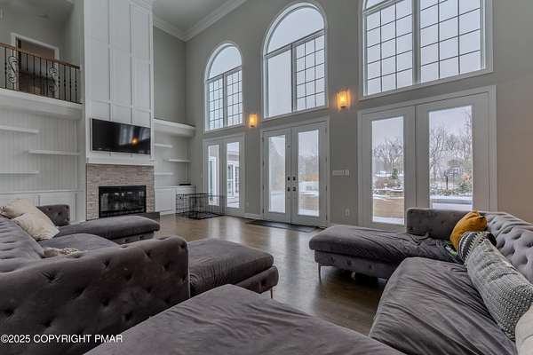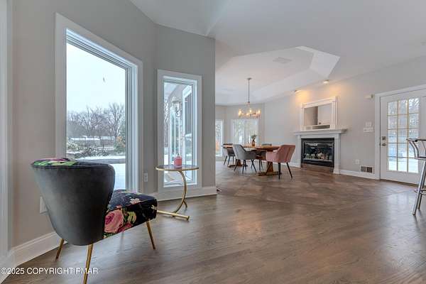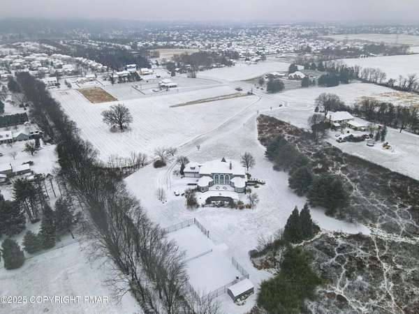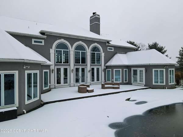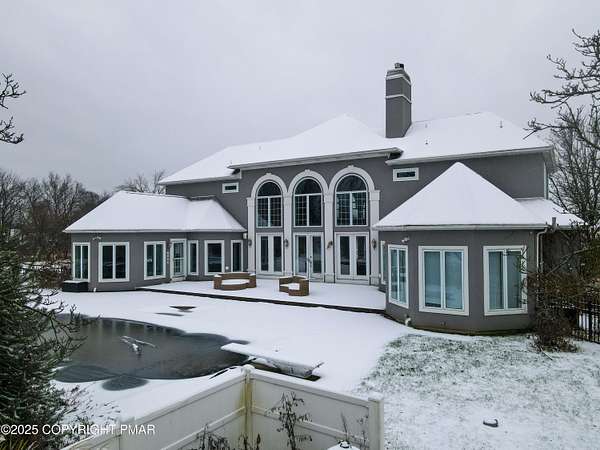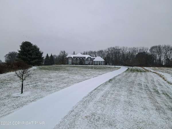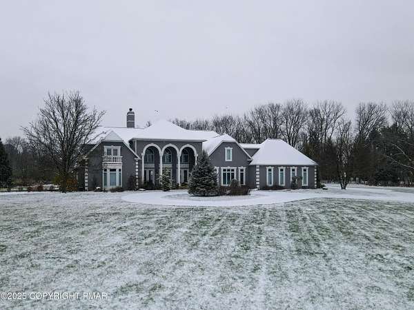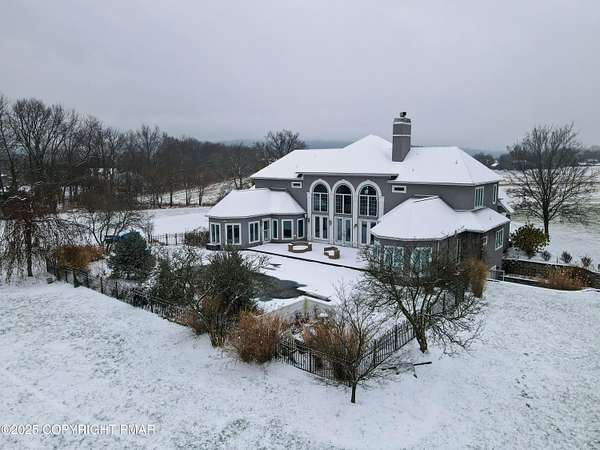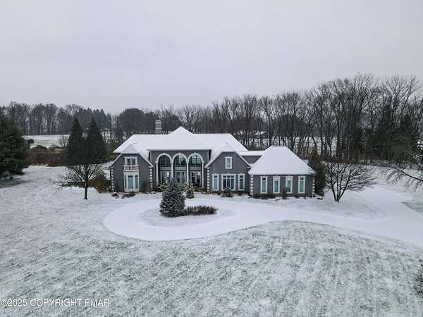 A residence of rare distinction, this one-of-a-kind architectural masterpiece offers over 5,200 sq. ft. of refined living space plus an additional 2,200 sq. ft. luxury finished walkout level on 13.5 Acres! Beyond the covered entry, guests are welcomed into a breathtaking 22-foot vaulted great room and formal dining area, framed by a dramatic wall of windows, rich hardwood floors, a wood-burning fireplace, and a sophisticated resort poolscape. The first-floor Primary Wing is a true sanctuary, featuring a gracious sitting room, elegant library with fireplace,offering the ultimate blend of comfort and privacy. At the heart of the home, the gourmet kitchen showcases premium finishes and opens seamlessly to the warm and inviting family room with gas fireplace and direct access to the custom-designed patio, inground pool with waterfall, and outdoor entertaining areas. The second level provides exceptional accommodations with three private bedroom suites, each with its own bath, along with a luxurious guest suite ideal for extended stays. The spectacular walkout lower level elevates the home's entertainment appeal with a handsome sit-down wet bar, an expansive game room, offering endless recreation for family and guests. Outdoors, this estate transcends tennis/basketball court and expansive patio, additional storage garage, and serene shared pond at the property's edge. A rare offering that perfectly balances luxury, privacy, and leisure!