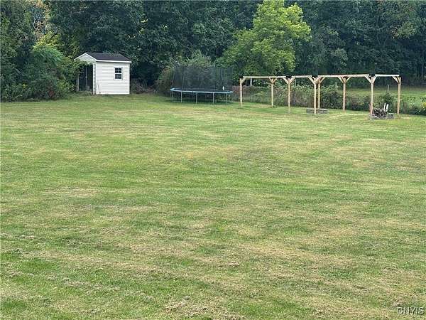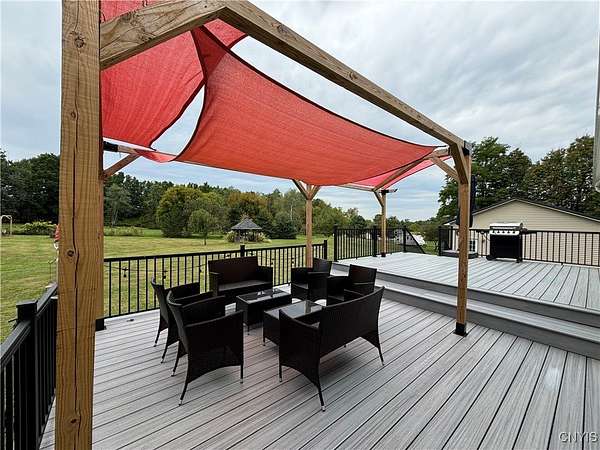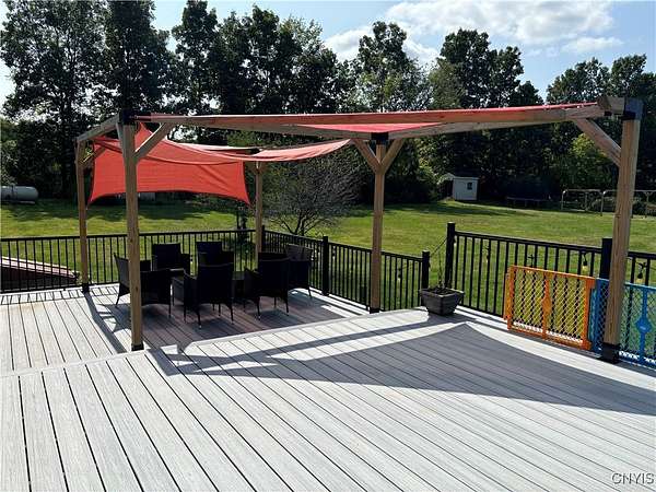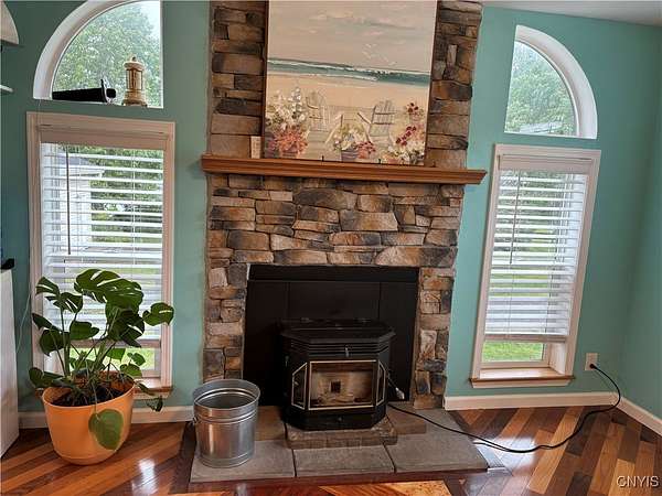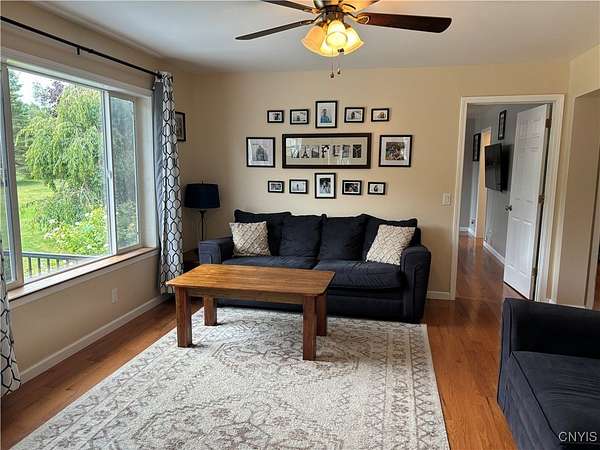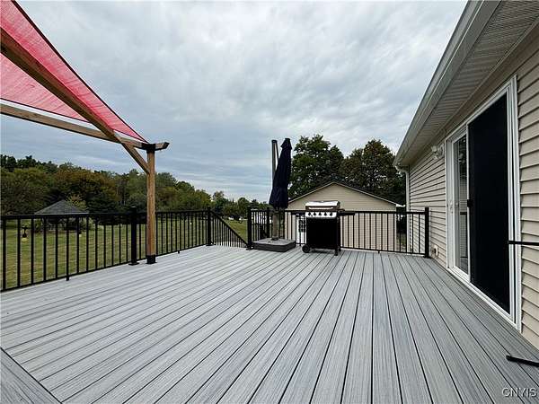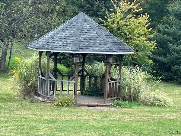 No doubt you'll get that peaceful easy feeling, inside and out. You'll love this ranch style home with full, partially finished lower level, in a beautiful country setting. Situated on 1.70 acres, a gazebo for relaxing, there are some apple trees, and spend time near the fire pit under the pergola. Inside is all the space you need for privacy, your work area and a room for your favorite past time. 1,748 sq ft of one level living featuring 3 bedrooms and 2 baths including the primary suite with sink and vanity in its own room. The other two nice size bedrooms are right next to the second full bathroom with tub. Each room has a modern ceiling fan. The laundry room is off the kitchen within the coat room. The hardwood floor in the kitchen and dining room is gorgeous and you can stay cozy by the pellet stove surrounded by stone wall and windows that keep it bright. Off the kitchen, open the sliding glass door, step out onto the spacious Trex deck, and enjoy the view. The lower level just keeps going. The utilities, radon mitigation system and shelving plus room for storage on one side - the water softener system is newer installed in 2023. The other side that's partially finished includes three additional rooms. Push one button and the electric garage door openers allow easy access into the two car detached garage. Septic system-July 2022 added a new tank and replaced the leach field. Three sheds to use however you like and the tree house is an added plus. You won't want to leave!