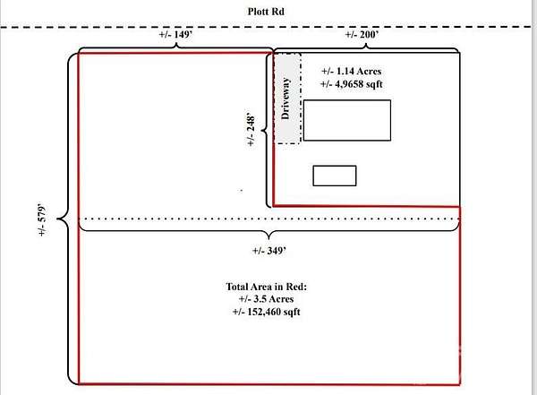 Selling 3.50 acres on busy Plott Road,, Great Location! Seller will subdivide 3.50 acres out of 4.64 acres to exclude house and 1.14 acres. The proposed subdivision plat is for illustration purpose only. This plat was for the entire lot. Seller is only selling 3.50 acres. City Water and City Sewer available, tap fee required. This is a great opportunity!!