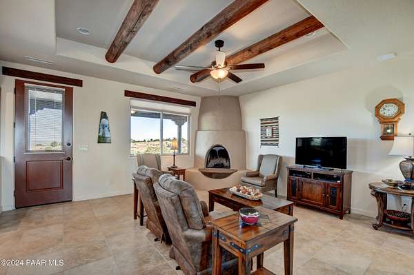 Beautiful, new Santa Fe style home custom designed by renowned local architect Carlos Levya. Large courtyard entry leads you into this gorgeous 3 bedroom home with an office and includes numerous custom touches like wood beams and accents. A breakfast nook is tucked off the side of the chef's dream kitchen which has plenty of cabinets and drawers plus a pantry. While having a unique design, you'll find no wasted space in this home. Don't miss the private patio just off the master. The garage is oversized and has a propane heater & includes a small heated/cooled room ideal for a workshop or storage. There are just so many unseen nice touches in this home such as the whole house ventilation system, extra insulation, in ceiling heater for master shower, on demand hot water, buried propane tank (leased) & the list goes on. The water softener is owned & conveys. Two acres are fenced & the remaining 11 acres are taxed for agriculture grazing resulting in a tremendous property tax credit.