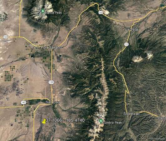 Coming from Fort Garland on State Route 159 into San Luis, turn left (east) at the Conoco gas station. Once you leave town this road is called P6. Follow for 2.5 miles until you come to a 4-way stop. Turn right on Rd. 21 and follow for 1.5 miles. Turn right on Rd. L5 (dirt road) and follow for 1.4 miles. Take a sharp left on Rd. 18.9. Go up the mountain for 3.6 miles. Take a left turn (W) on Overland Way. Follow for 2.1 miles. Turn left (S) on Skyline Dr. Follow for 0.4 mile. Property is to your left (E).