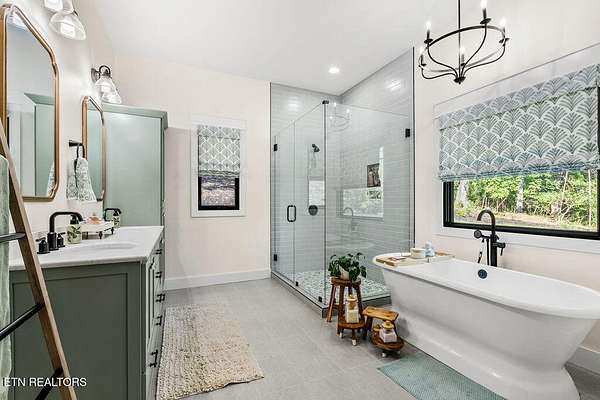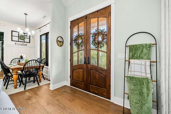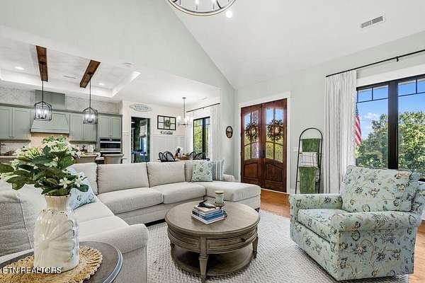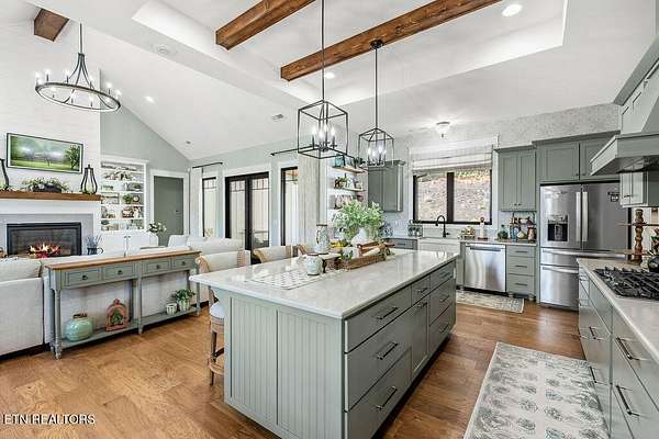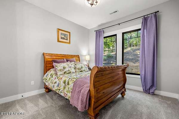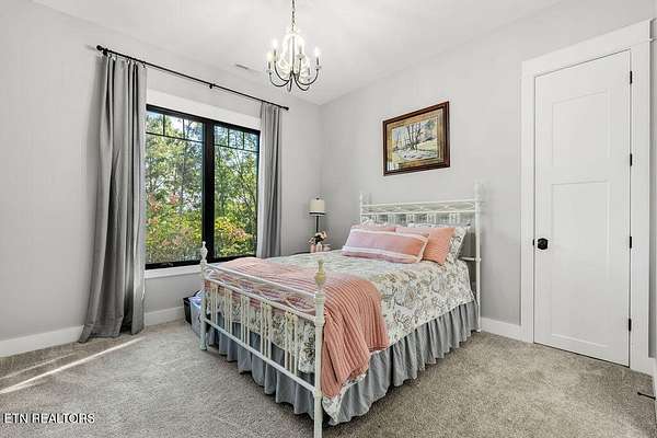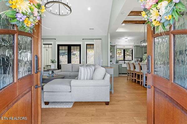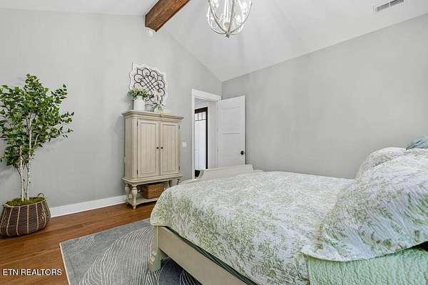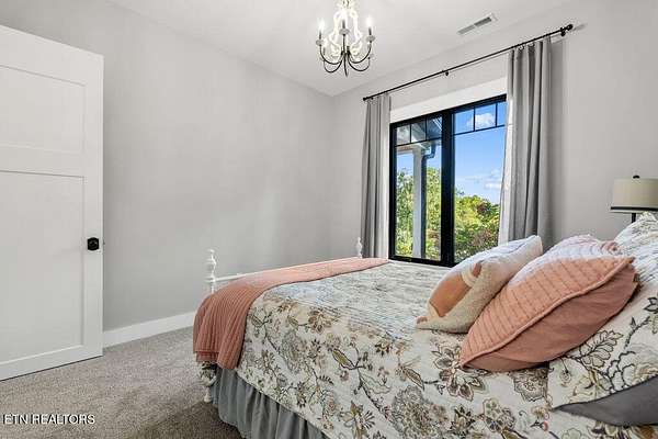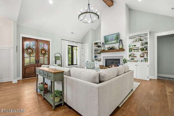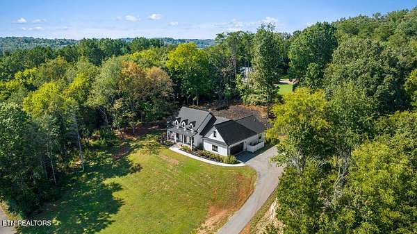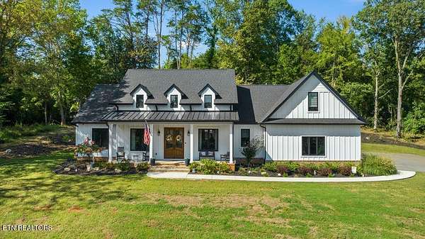 This recently constructed custom home blends timeless craftsmanship with modern design, set on 2 private wooded acres with serene lake views. Inside, you'll find 3 bedrooms plus a versatile bonus/office upstairs with closets and a half bath--perfect for a guest suite, office, or flex space. The home also features soaring 10 ft ceilings, 8 ft doors, and dramatic vaulted living spaces with hand-hewn wooden beams. The kitchen is a showpiece with furniture-style cabinetry, quartz countertops, a 9 ft island, full-height tile backsplash, gas cooktop with pot filler, wall oven/microwave, farm sink, and a walk-in pantry with antique entry door, copper sink, and custom cabinetry. A butler's pantry adds additional storage and prep space. The luxurious owner's suite features vaulted ceilings, 100-year-old antique double doors, a spa-like bath with quartz vanities, stand-alone tub, and a 10 ft tiled shower. The 11x17 walk-in closet includes built-ins, an island with quartz countertop, and direct laundry access. Additional bedrooms share a Jack-and-Jill bath with custom 84-inch double vanity. Wide-plank hardwood floors run throughout the living spaces, complemented by striking black custom windows and French doors. Outdoor living includes a covered rear porch (18x16), extended breezeway porch (18x8), paver patio (15x13), and an 85 ft stone retaining wall. The paved driveway with extended parking ensures convenience and function. This is truly a one-of-a-kind property, designed and detailed to perfection.