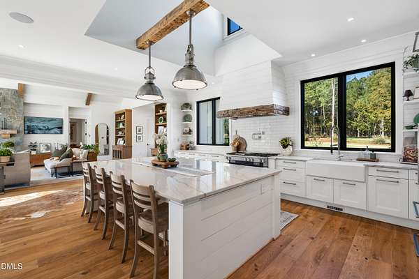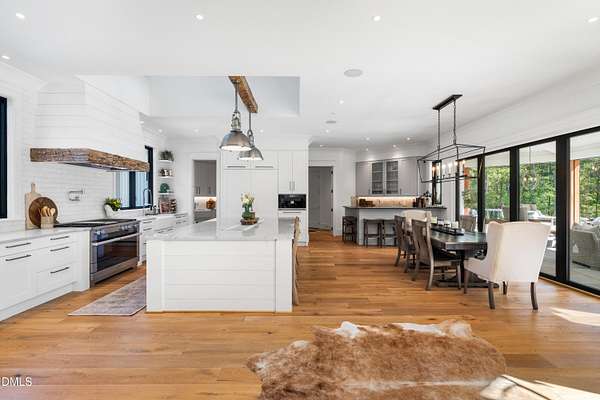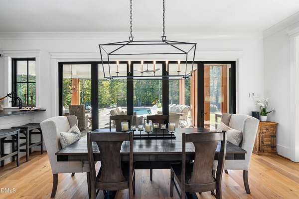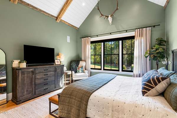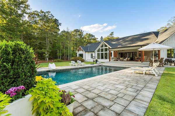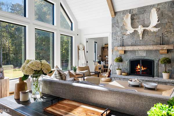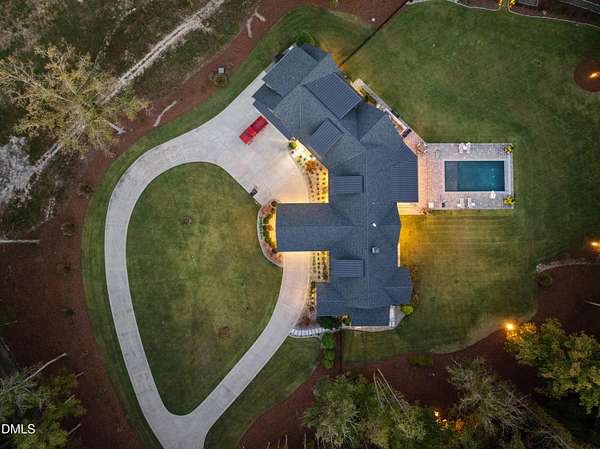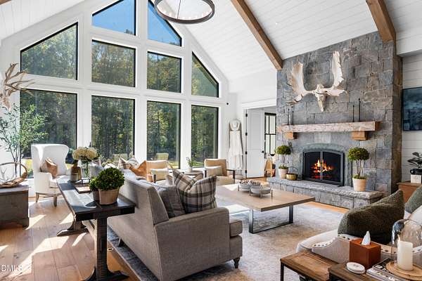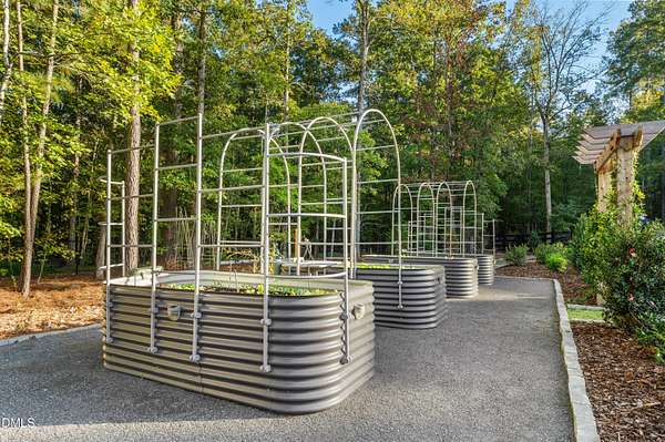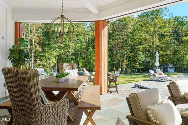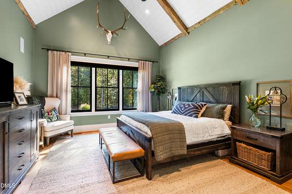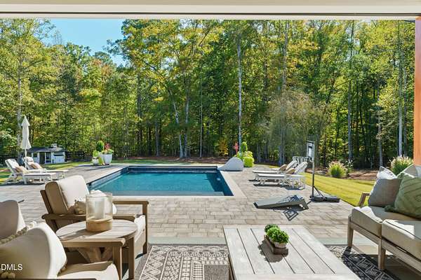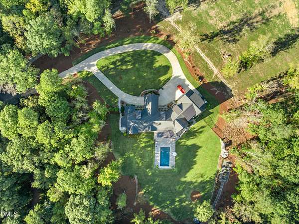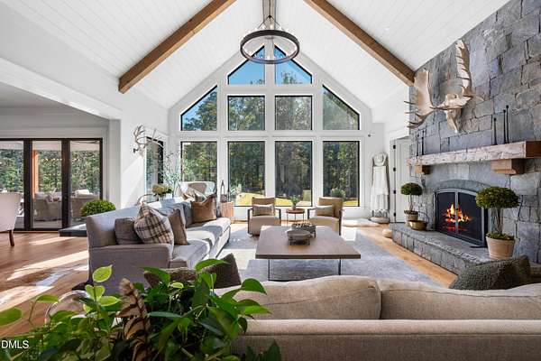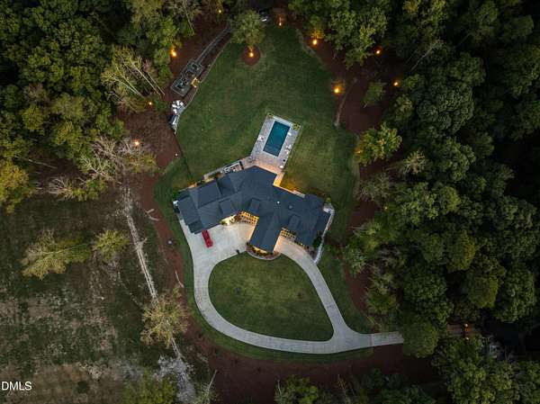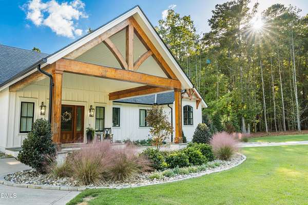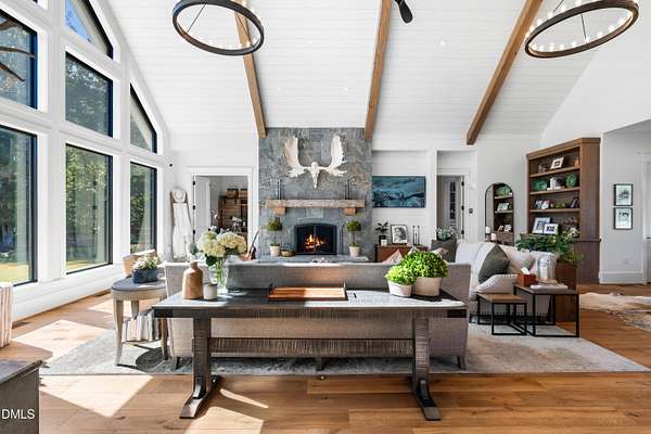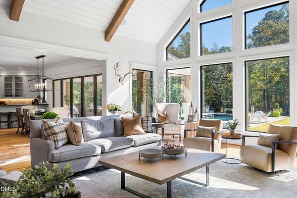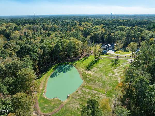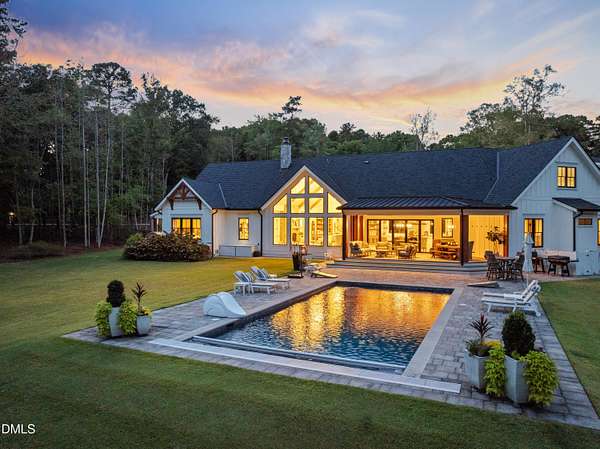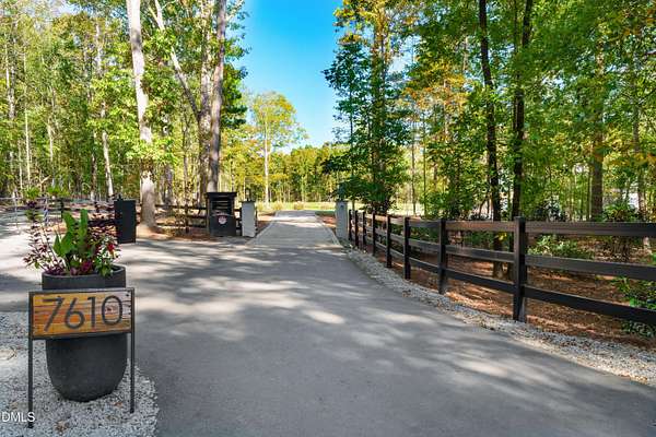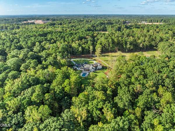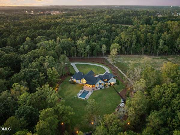 Welcome to this private gated estate set on over fifteen acres of serene countryside in the heart of Apex. This remarkable property offers a rare blend of peace, privacy, and proximity, where natural beauty meets effortless convenience just minutes from Highway 540. Thoughtfully crafted with timber beams sourced from Idaho and western North Carolina, along with rich cedar accents, the home is filled with warmth and character. Expansive windows flood the interiors with natural light while framing tranquil, wooded views from nearly every room. The main level features three bedrooms, including a stunning vaulted owner's suite complete with a private porch, outdoor shower, and sauna. At the center of the home, a two-story family room anchors the open-concept layout, connecting to a chef's kitchen outfitted with professional-grade Miele appliances, custom cabinetry, a walk-in pantry, and a fully equipped scullery with additional oven and prep space. Designed for both intimate evenings and large gatherings, the home also features an entertaining bar, a built-in coffee station, beverage drawers, and multiple flexible living spaces, including a game room, a private study nook, and a custom bunk room. Outdoor living is equally impressive, featuring a resort-style saltwater pool with sun ledge and automatic cover, expansive covered and Phantom screened porch and thoughtfully designed lounge and dining areas. The property also includes a private pond, fire pit, raised garden beds with watering station, custom chicken coop, and a fully fenced backyard surrounded by mature trees, creating a true connection to the land. Additional highlights include a 40-foot deep garage, smart home automation, Sonos audio system, pre-wired for generator, three HVAC systems, tankless water heater, whole-home water purification, porch piped for outdoor heaters, and a comprehensive security system. Conveniently located 7 minutes to new GRACE campus, 12 minutes to Target, and 4 minutes to I-540. This one-of-a-kind Apex estate offers a lifestyle defined by privacy, craftsmanship, and natural beauty - an extraordinary opportunity to experience refined country living without compromise.