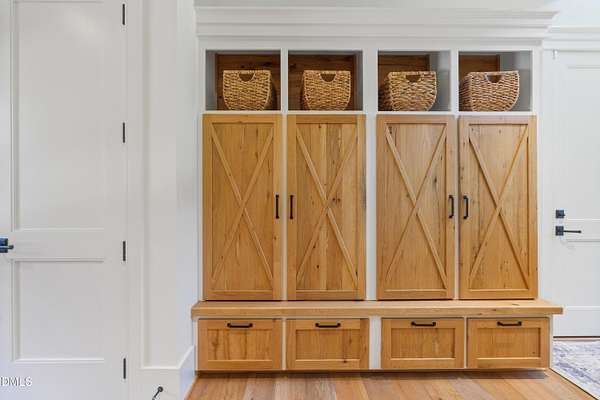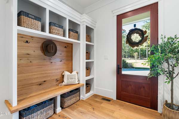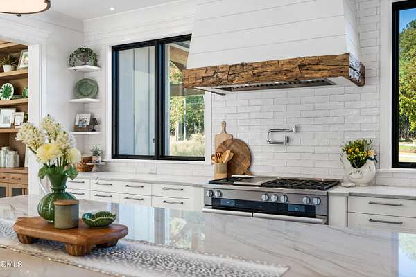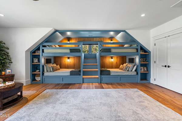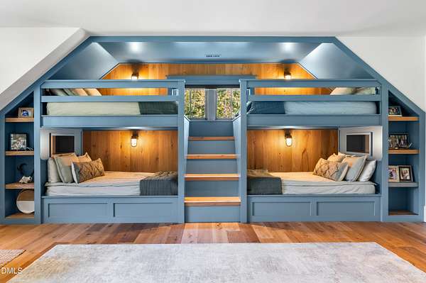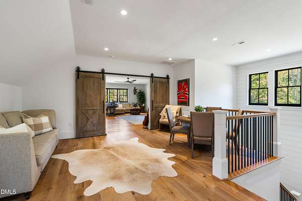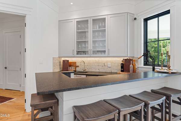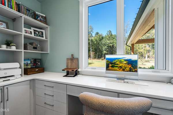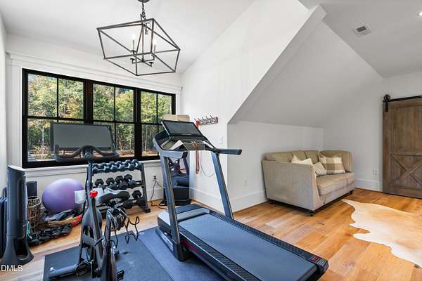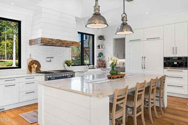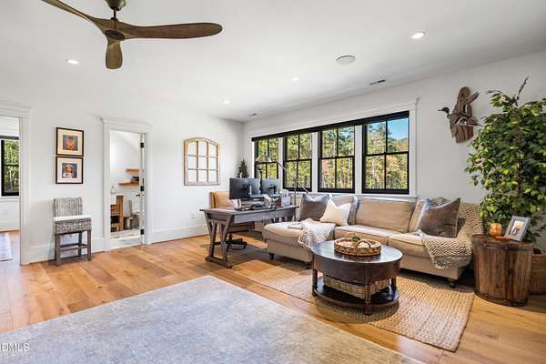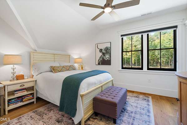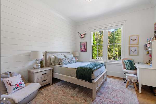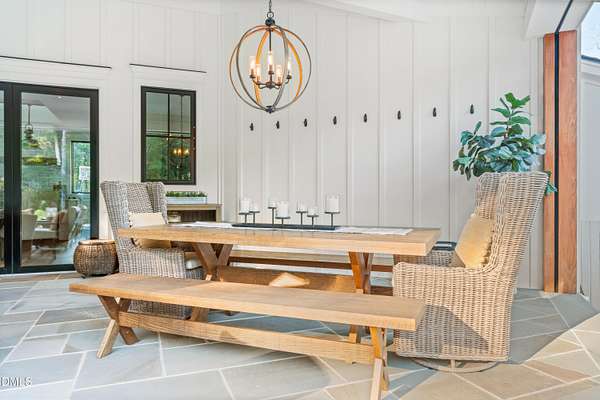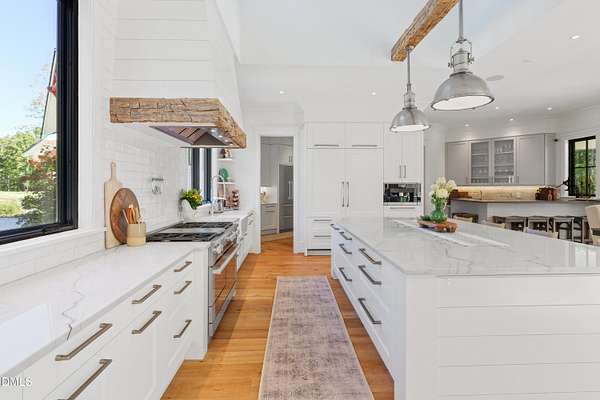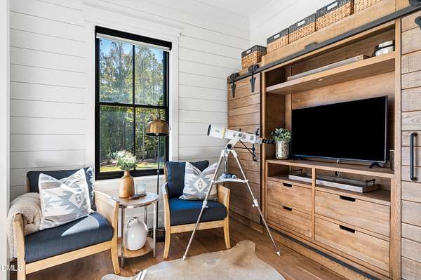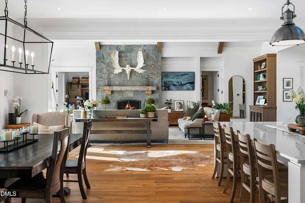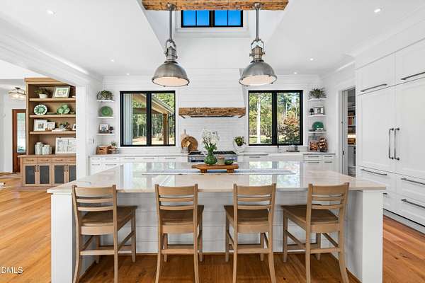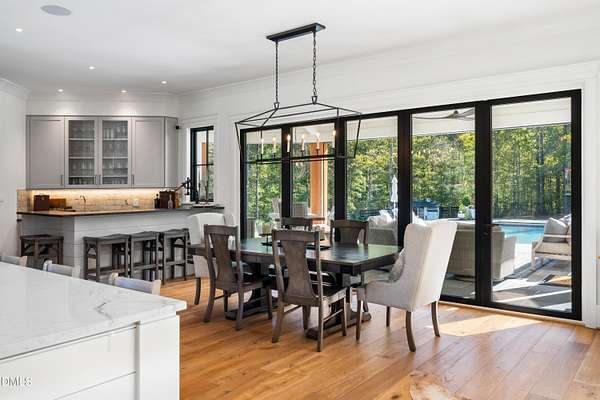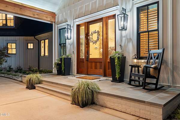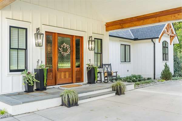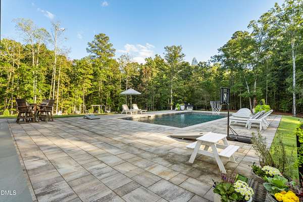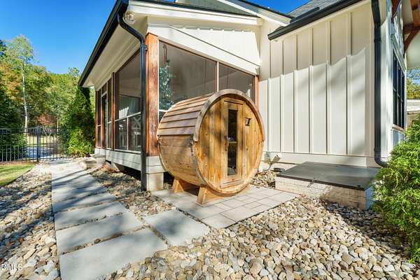 Welcome to this private gated estate set on over fifteen acres of serene countryside in the heart of Apex. This remarkable property offers a rare blend of peace, privacy, and proximity, where natural beauty meets effortless convenience just minutes from Highway 540. Thoughtfully crafted with timber beams sourced from Idaho and western North Carolina, along with rich cedar accents, the home is filled with warmth and character. Expansive windows flood the interiors with natural light while framing tranquil, wooded views from nearly every room. The main level features three bedrooms, including a stunning vaulted owner's suite complete with a private porch, outdoor shower, and sauna. At the center of the home, a two-story family room anchors the open-concept layout, connecting to a chef's kitchen outfitted with professional-grade Miele appliances, custom cabinetry, a walk-in pantry, and a fully equipped scullery with additional oven and prep space. Designed for both intimate evenings and large gatherings, the home also features an entertaining bar, a built-in coffee station, beverage drawers, and multiple flexible living spaces, including a game room, a private study nook, and a custom bunk room. Outdoor living is equally impressive, featuring a resort-style saltwater pool with sun ledge and automatic cover, expansive covered and Phantom screened porch and thoughtfully designed lounge and dining areas. The property also includes a private pond, fire pit, raised garden beds with watering station, custom chicken coop, and a fully fenced backyard surrounded by mature trees, creating a true connection to the land. Additional highlights include a 40-foot deep garage, smart home automation, Sonos audio system, pre-wired for generator, three HVAC systems, tankless water heater, whole-home water purification, porch piped for outdoor heaters, and a comprehensive security system. Conveniently located 7 minutes to new GRACE campus, 12 minutes to Target, and 4 minutes to I-540. This one-of-a-kind Apex estate offers a lifestyle defined by privacy, craftsmanship, and natural beauty - an extraordinary opportunity to experience refined country living without compromise.