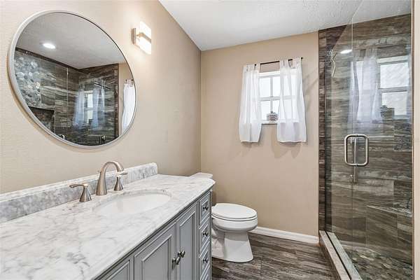 One or more photo(s) has been virtually staged. New roof to be installed prior to closing! Located in Tanglewood East, this 3 bedroom, 2 bath home on over an acre offers the ideal blend of privacy, functionality, and country living while still being conveniently close to town. Situated on a quiet cul-de-sac with no front neighbors and a vacant lot next door, the property provides a peaceful setting with excellent access through double gates to the fenced pasture and barn, perfect for horses, livestock, equipment, or hobby use. Inside, the home features a fully upgraded kitchen with Brown Fantasy countertops, modern lighting, and all-new appliances. The spacious family room includes a wood burning fireplace and flows into the dining area, with additional flexible space ideal for a home office or sitting area. The split bedroom floor plan offers tile flooring throughout, an updated guest bathroom, and an updated primary bathroom with a frameless glass shower, along with a large walk in closet in the primary suite.