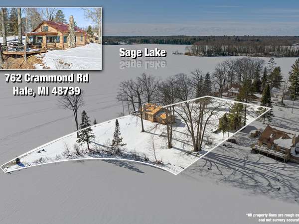 m55/m33 north on m33 6+/- miles to County Hwy F 26/E Sage Lake Rd follow east for 9+/- miles, Turn right onto Crammond Rd follow to end veer left onto property