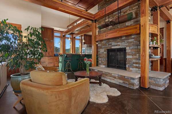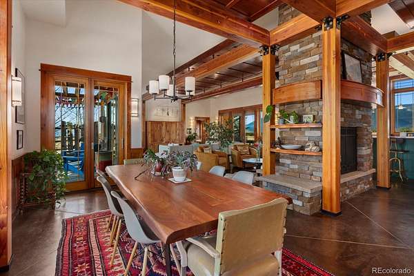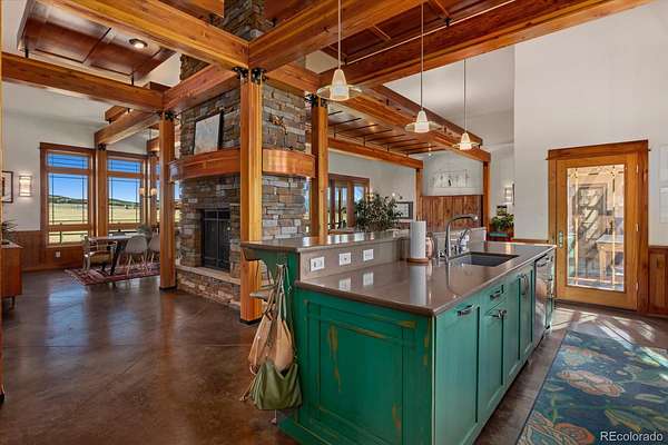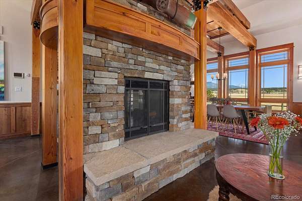 The open floor plan features exposed cedar beams, abundant natural light, and durable stained concrete floors. The great room is anchored by a striking stone fireplace and flows seamlessly into the dining area and kitchen with butler’s pantry, ample cabinetry, and a spacious utility room with access to a heated loft for additional storage.