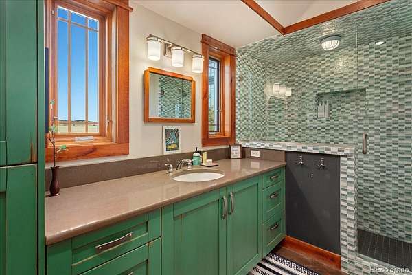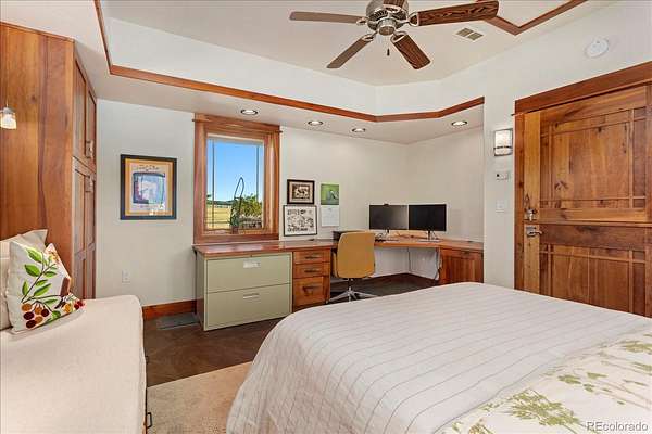 The detached garage and guest quarters features in-floor radiant heat throughout and includes an oversized two-car garage, a heated bunk room with full bath, an office or bonus room with an electric fireplace, and a spacious storage area.