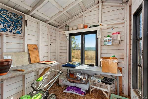 Equestrian-ready with loafing shed, corral with automatic waterer, hay storage, and 9.9 irrigated acres supported by one full share of Missouri Park Ditch water with flood and sprinkler irrigation.