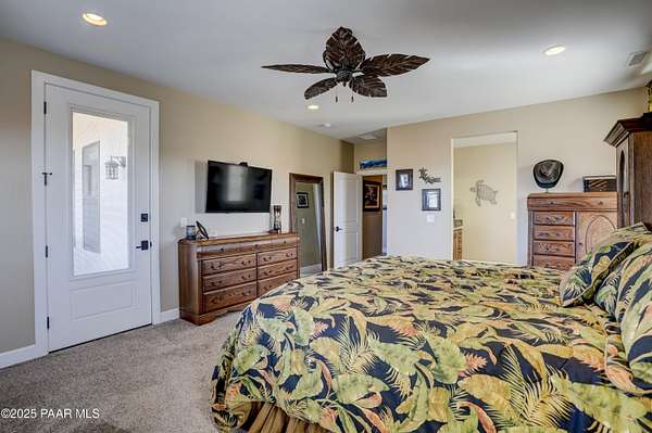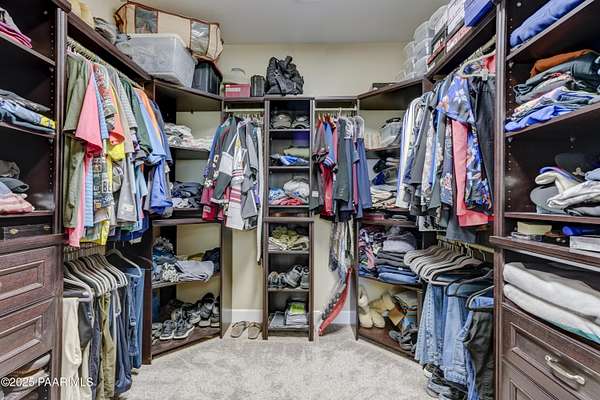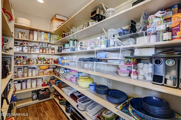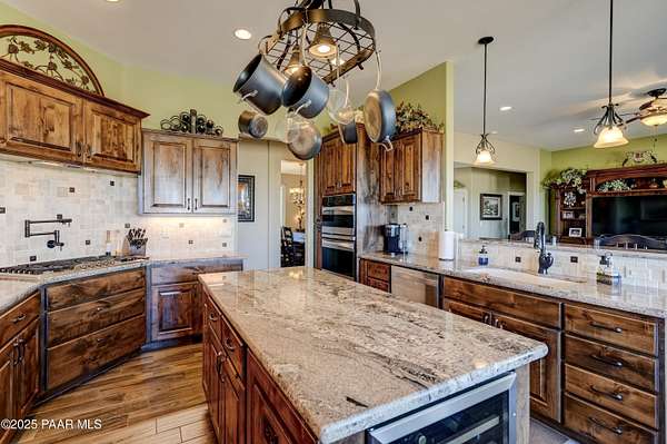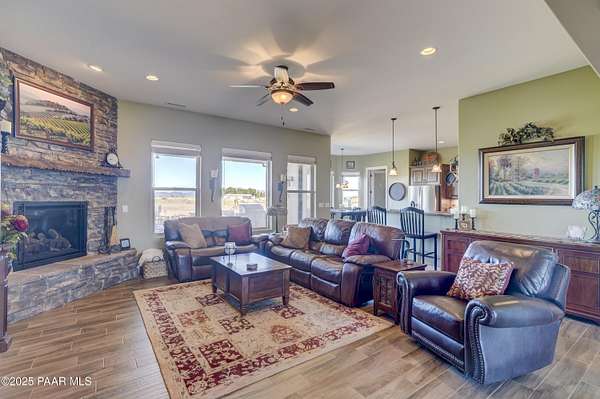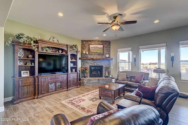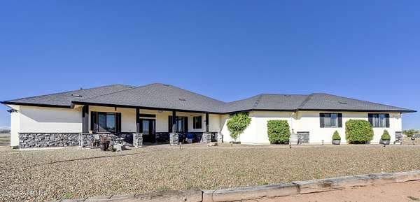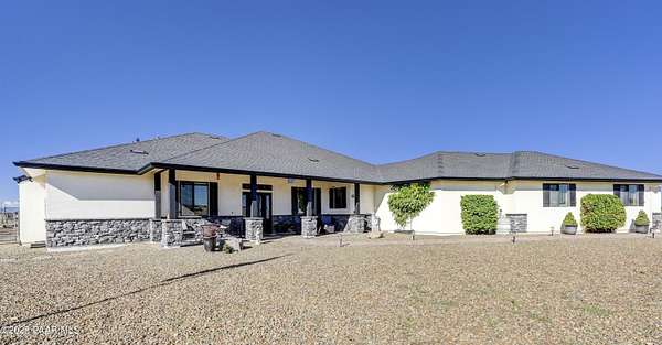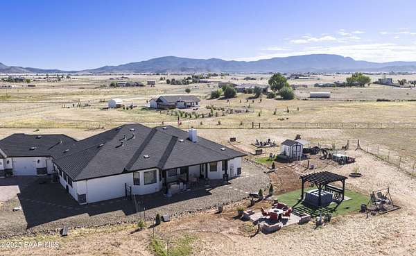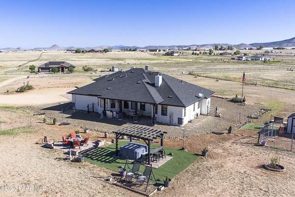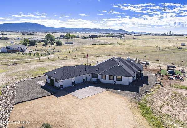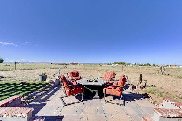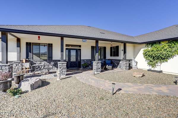 Natural Beauty & Panoramic VIEWS surround this SUPERB CUSTOM Prescott Valley Mt Home on spacious 5 ACRES in Antelope Meadows. Designed and Built in 2017. A Perfect 4bd 2.5Ba Split plan within 2831sf Captivating Interior. Entire home has custom built solid ALDER WOOD cabinets throughout including the Kitchen, Wine Room, bathrooms and laundry rm. Enjoy the great room ambiance with floor to ceiling stone gas FIREPLACE & rustic wood mantel. Lg. Kitchen is COOKS DREAM with custom cabinets, gorgeous GRANITE countertops and premium mosaic backsplash. Stunning stainless appliances convey. Stovetop with Pot Filler above. Lg. Island with built-in Wine Fridge. Unique recipe labeled walk-in pantry with complete shelves. Raised Bar to great room plus west Kit/Din nook. Beautiful woodgrain porcelain tile throughout and comfy carpet in 3 bedrooms. Primary bath has lg. walk-in TruStone shower and walk-in closet W/nice organizer unit. The main guest bthrm. Has walk-in shower & double sinks. The enlarged 2 CG has roomy Workshop including 1 tool unit & Freezer. Plenty of exterior RV PARKING! This Fabulous home perfect for ENTERTAINING INSIDE & OUT! Front & Back FIRE PITS with seating. Back area has rustic pergola with Tough Spa Hot Tub.Complete Horseshoe game area ready to play! Behind home is fenced 20'x30' area perfect for Kennel, chicken coop, garden etc. plus enclosed 8'x10' shed. This home a MUST SEE! You'll love custom touches with many features that stay! MOVE IN READY!