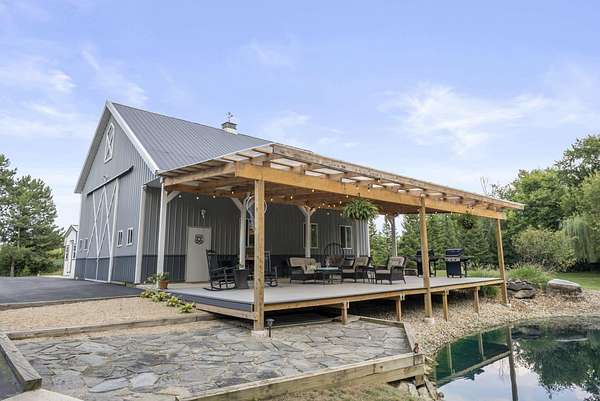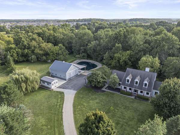 A Rare 7-Acre Private Estate in Dublin City Schools - opportunities like this don't exist! Set on nearly 7 wooded acres with a private pond, scenic creek, and wide-open green space, this exceptional property offers the rare combination of land, privacy, and location - all within the highly sought-after Dublin City School District and just minutes to shopping, dining, and major highways. Designed for those who value space, function, and flexibility, the property includes a striking 32x40 barn with oversized sliding doors - ideal for car collectors, boaters, hobbyists, entrepreneurs, or anyone needing serious storage and workspace. A separate heated and air-conditioned office building with full electric provides the ultimate work-from-home setup or private studio. The 5-bedroom home offers warm, inviting interiors with refinished hardwood floors throughout the main level, a finished basement, and abundant storage. Recent improvements include professionally painted cabinetry and vanities, updated lighting, freshly painted trim and doors, newly refinished hardwood floors, and new carpet in the primary suite and staircase. Newer windows and charming board-and-batten exterior details enhance curb appeal and future value potential. Step outside and experience what truly sets this property apart - fish in your own private pond, host summer gatherings under the covered overhang, add gardens or expand outdoor living spaces, or create the estate feel you've always envisioned. A large chicken coop is already in place for those drawn to a refined homestead lifestyle. For buyers seeking acreage without sacrificing top-tier schools or proximity to the city, this is an extraordinary and rare opportunity. Whether you choose to enjoy it exactly as it is or elevate it into a fully customized luxury estate, the foundation is here - and the setting cannot be replicated. Private. Functional. Distinctive.
