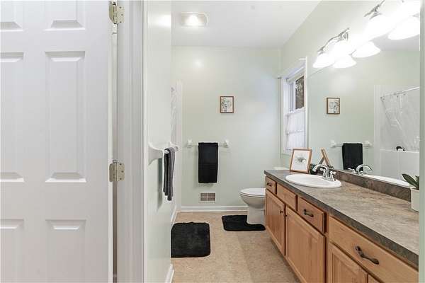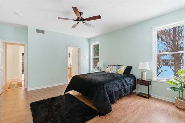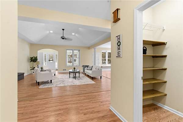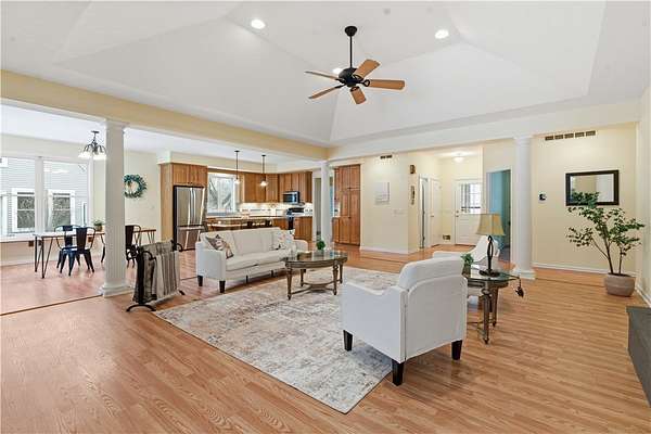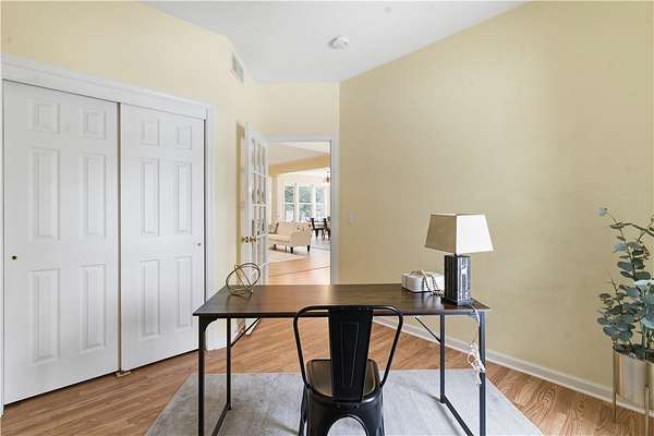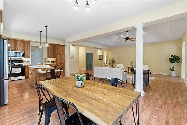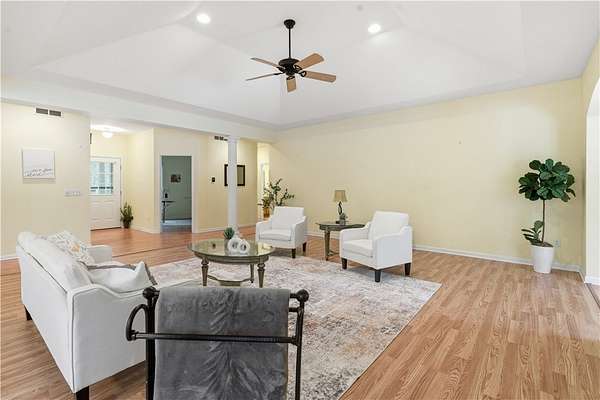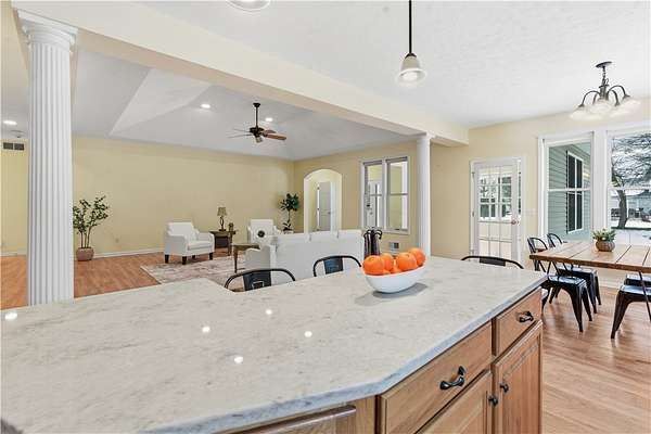- Bath In Primary Bedroom, Bathroom Rough In, Bedroom On Main Level, Cathedral Ceilings, Ceiling Fans, Convertible Bedroom, Dining Area, Eat In Kitchen, Granite Counters, Great Room, Home Office, Kitchen Family Room Combo, Kitchen Island, Living Dining Room, Main Level Primary, Primary Suite, Separate Formal Dining Room, Separate Formal Living Room, Solid Surface Counters