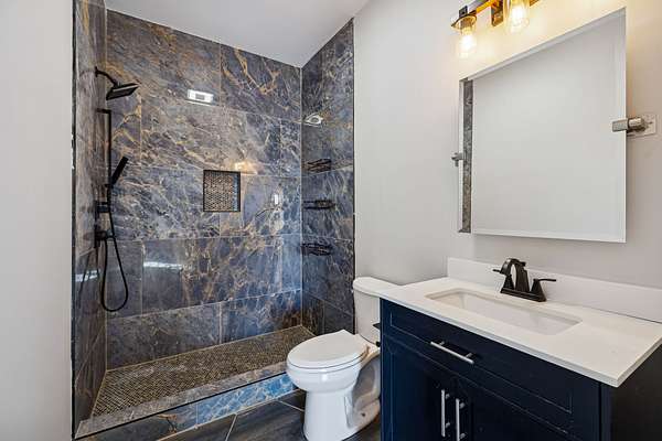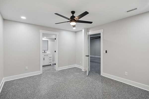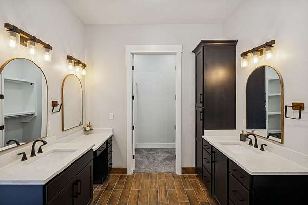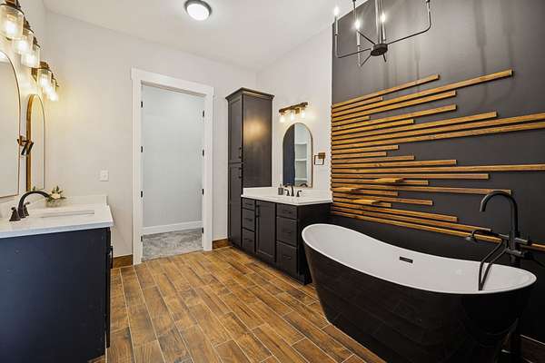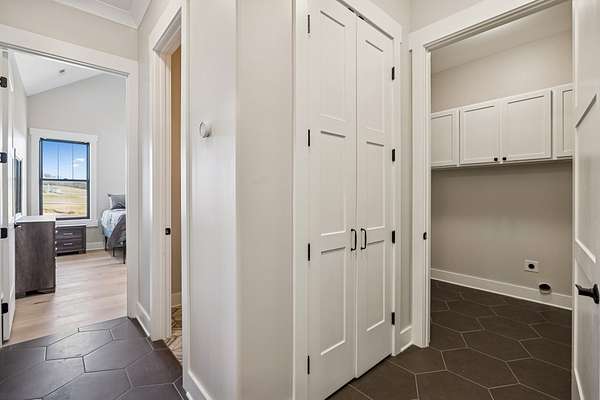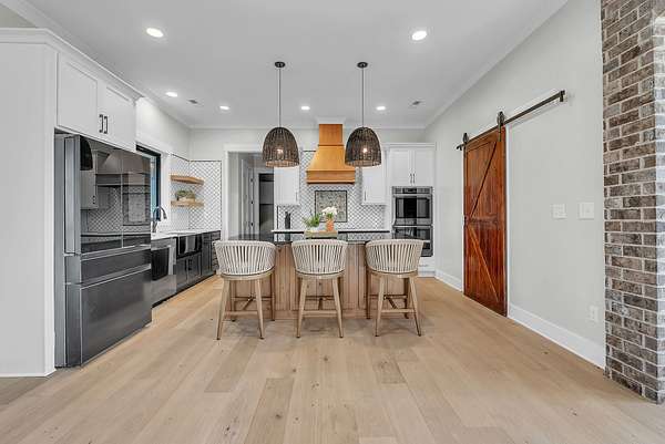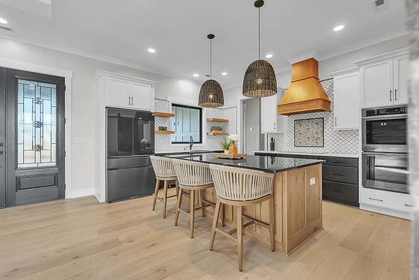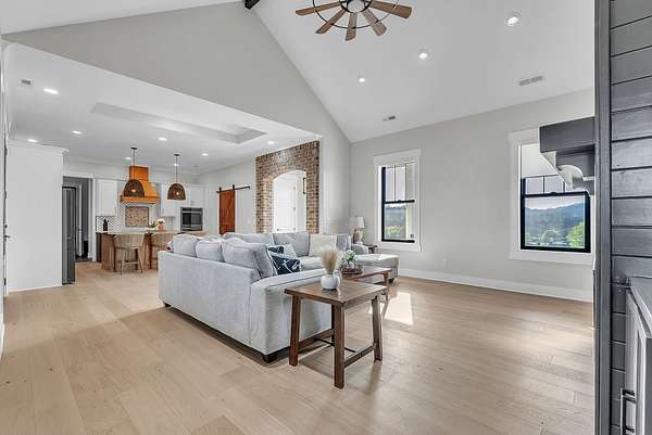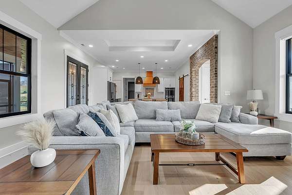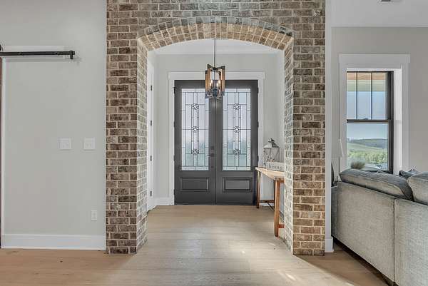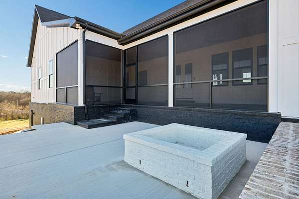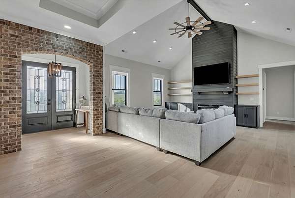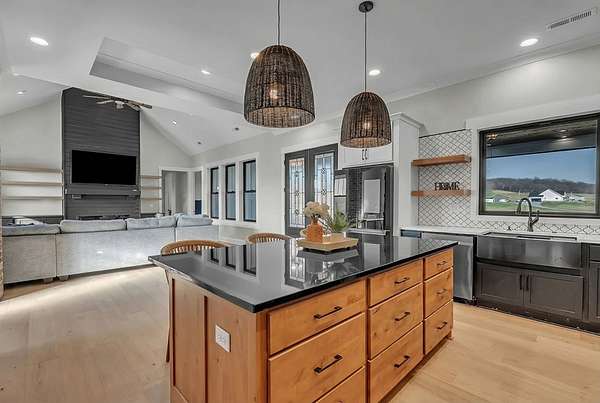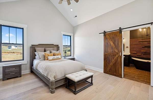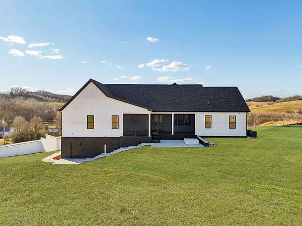 Discover your private retreat surrounded by rolling scenic views in this beautifully crafted 4-bedroom, 3.5-bath home designed for both everyday comfort and unforgettable entertaining. From the moment you arrive, the striking brick front entryway and custom double doors set the tone for the craftsmanship found throughout. Inside, real hardwood floors lead into a bright open-concept living space featuring vaulted ceilings and a stunning floor-to-ceiling fireplace that anchors the room with warmth and character. The gourmet kitchen is a dream for both cooking and gathering, offering double ovens, custom cabinetry, a spacious island, tile backsplash, and a walk-in pantry. All bedrooms are conveniently located on the main level, creating an ideal layout for both privacy and functionality.The luxurious primary suite is a true retreat with direct access to the back patio. It features dual vanities with a dedicated makeup space, two large walk-in closets with custom built-ins, and a spa-inspired bath featuring elegant tilework, a soaking tub, and an oversized tiled shower. Step outside to enjoy the peaceful surroundings on the covered back porch with warm wood accents, plus an additional open-air entertaining space complete with a built-in fire pit—perfect for gathering with friends and family while taking in the views.Upstairs, a spacious bonus/media room provides the ideal space for movie nights, game days, or a playroom.Downstairs, the massive finished basement—nearly the same footprint as the main level—offers incredible flexibility. Imagine a home gym, golf simulator, in-law suite, game room, home theater, or additional living quarters for older children or guests. Additional highlights include abundant storage throughout and a 2-car garage withextra storage and epoxy flooring. This home blends luxury, comfort, and space in a setting that feels private yet inviting.