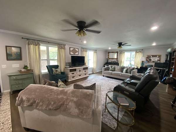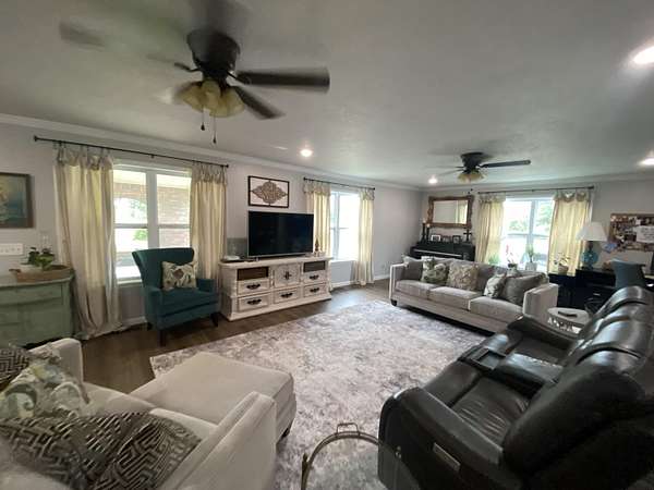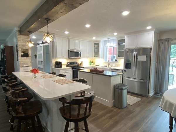The perfect mini farm! Modern Farmhouse charm! Nestled among the trees awaits a completely remodled, all brick, 4 bedroom, 2 bath, one level home, on 20 flat, usable acres. Circle drive with porte-cochere parking. Large open living room w/ white washed brick FP & wood beam, open to the all new island kitchen. The dining area has new French doors to a new deck & fenced yard. New: solid surface flooring throughout, paint, windows, cabinets, tile, doors, appliances, HVAC, & 2 hotwater tanks! 4 oversized bedrooms, w/ plenty of storage. Outdoors there is a new 40x50 insulated shop w/ 12x12 doors, plumbed for a bath, 20x40 patio, pool w/ decks, loaf shed, & the best hunting. 2 other storage buildings. 5 Minutes to shopping, dining, local hotspots! MOTIVATED SELLERS!