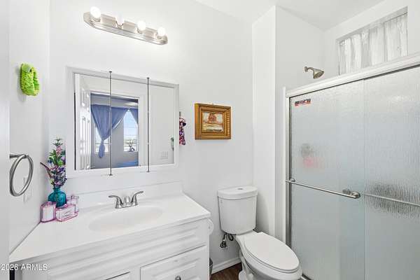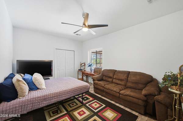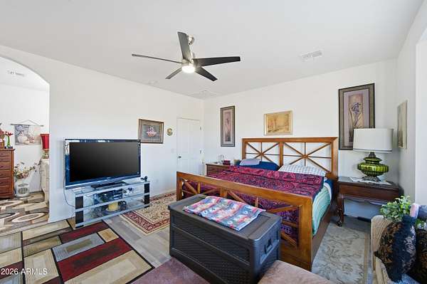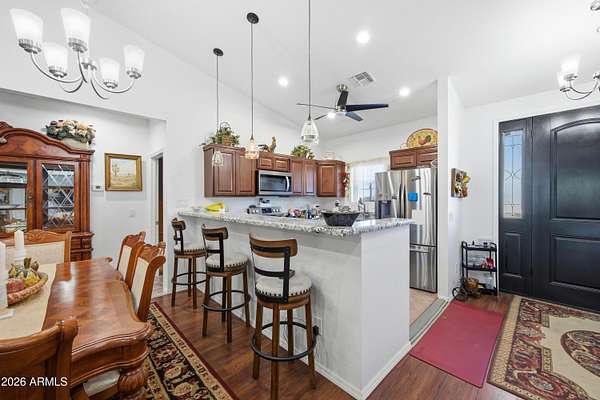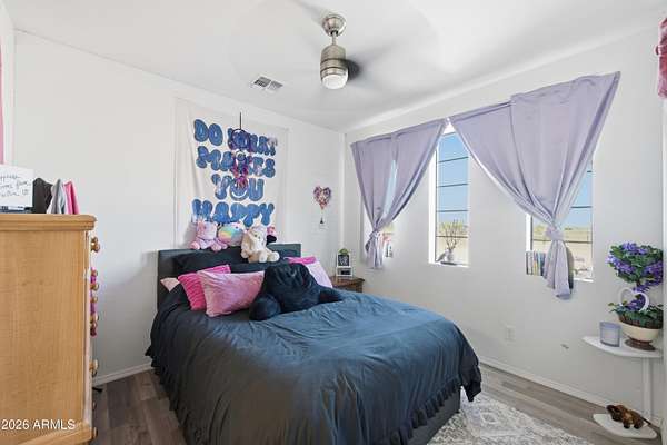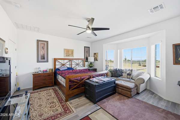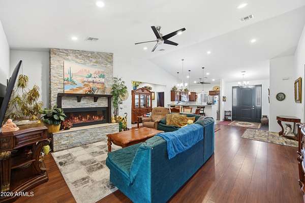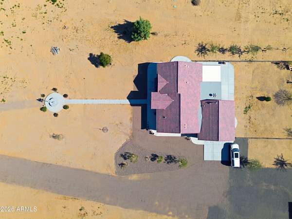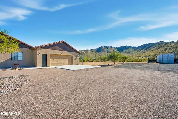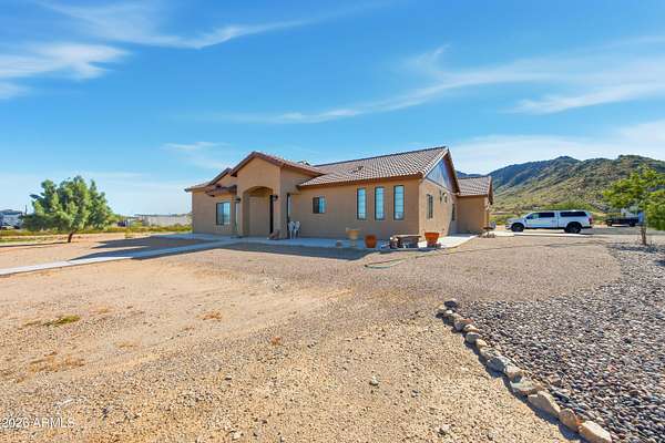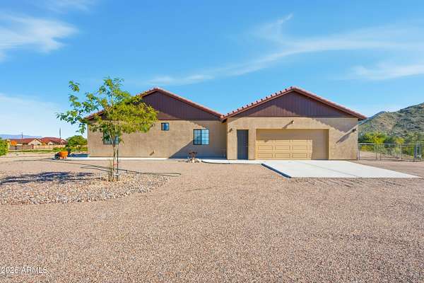Stunning 4-bedroom, 4-bathroom home built in 2021, situated on an expansive 3.38-acre lot in desirable San Tan Valley. This property offers the perfect blend of modern comfort and wide-open space, featuring a beautifully landscaped, fenced-in yard with a charming fountain and breathtaking mountain views. The open-concept kitchen boasts granite countertops, which continue throughout all bathrooms for a cohesive, upscale feel. A spacious three-car garage provides ample storage and parking. Enjoy privacy, room to roam, and serene desert surroundings while still being close to local amenities. This exceptional property is ideal for those seeking space, views, and contemporary living.